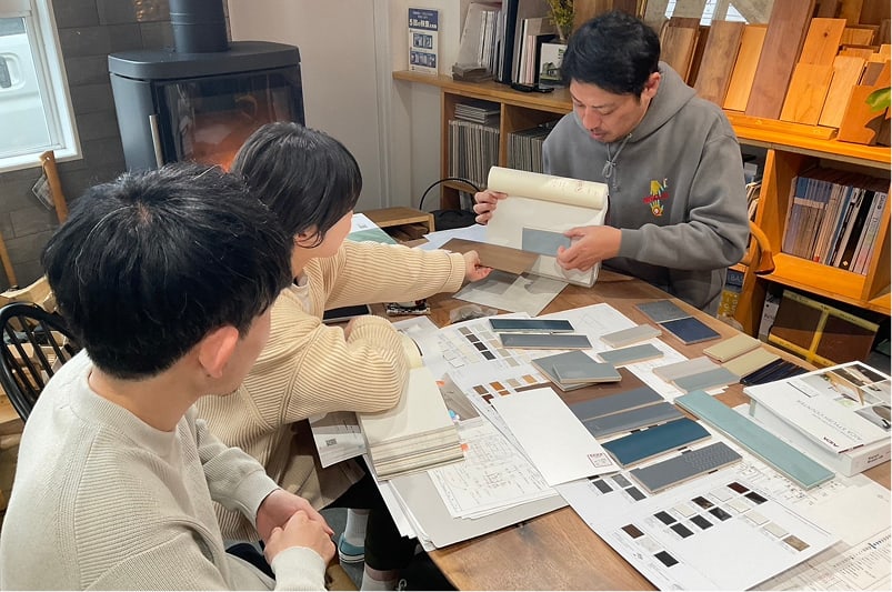 間取りがまとまったあとは、素材や仕様をお客様と一緒にひとつひとつ決めていきます。例えばスイッチの高さや色、電球の色味、造作家具の引出しのサイズや取手まで 「こんなところまで決めるんですか」と驚かれることもあります。ミリ単位でお客様のこだわりを住まいに反映するその姿勢は、桐工房の何よりの自慢です。打ち合わせの回数は少し多いかもしれませんが、細部まで一緒に考えることで、暮らしの中に"想い出"や"愛着"を感じていただけると考えています。