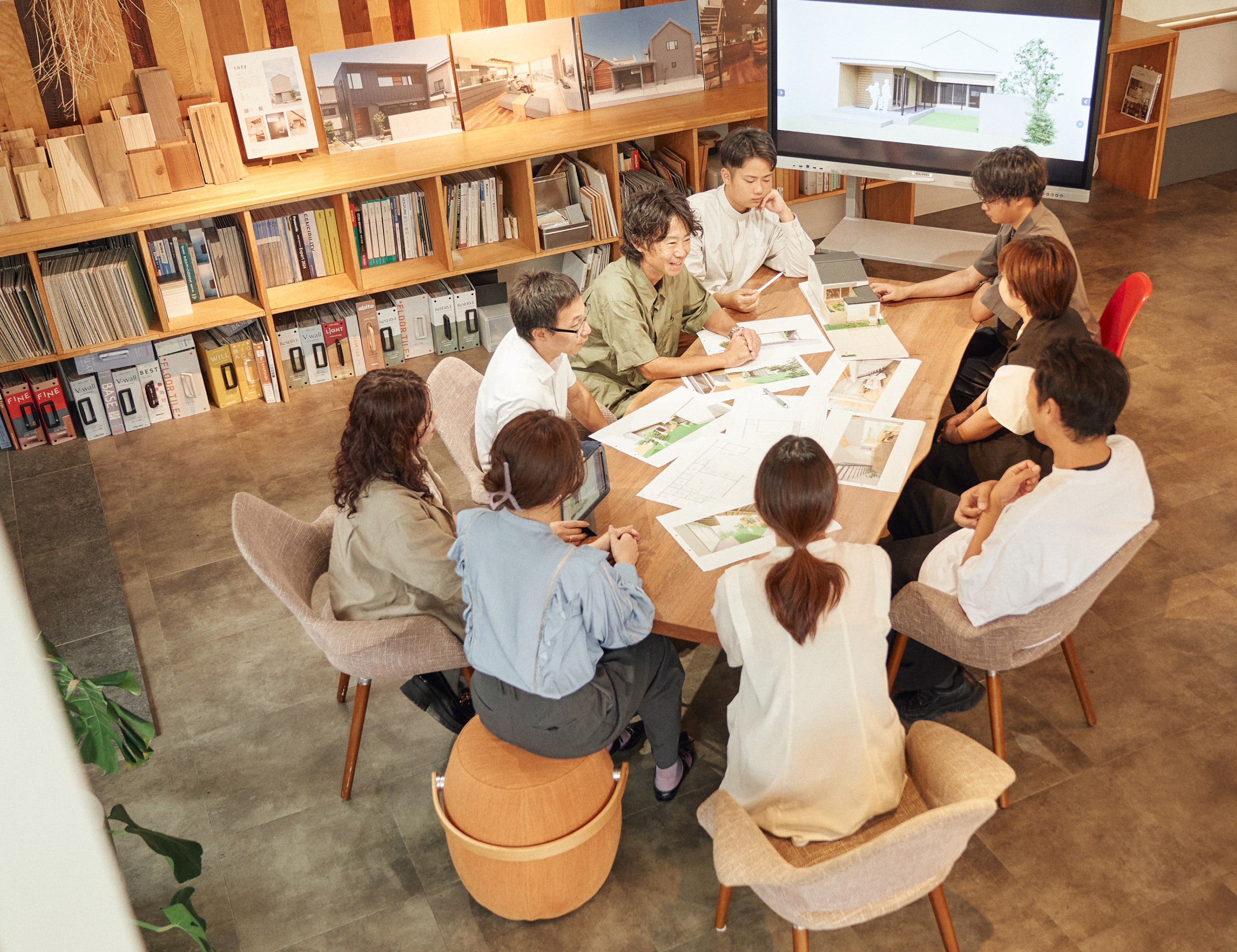 空間をすっきりと見せる納まりの良い建具や枠材など、職人の技術を活かした家づくりに取り組んでいます。 特に、使い勝手と収納力に優れたオリジナルの造作家具は、年月とともに味わいが深まり、既製品では出せない洗練された特別な空間を演出します。大工として豊富な経験を持つ社長を中心に、すべてのスタッフが徹底的にお客様の想いに寄り添い、理想の住まいをかたちにしています。