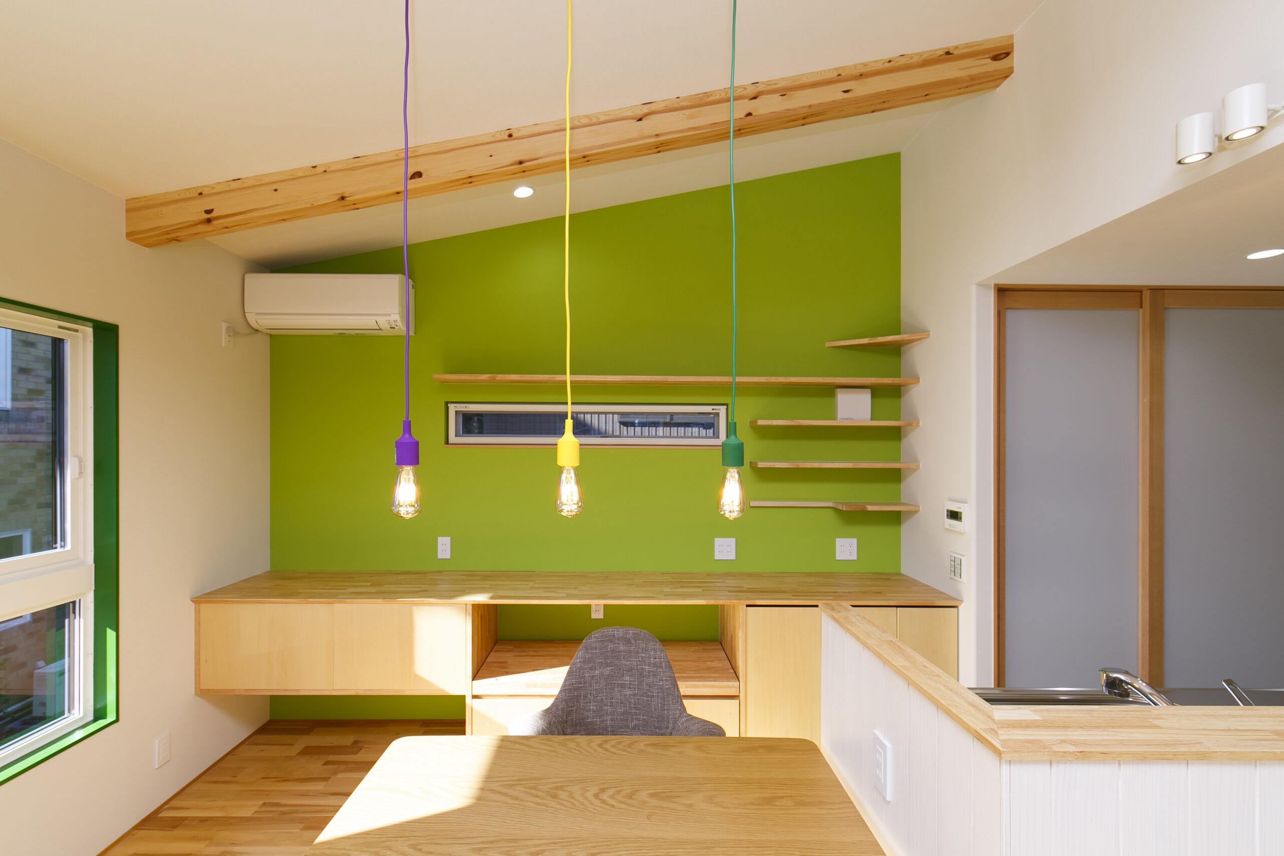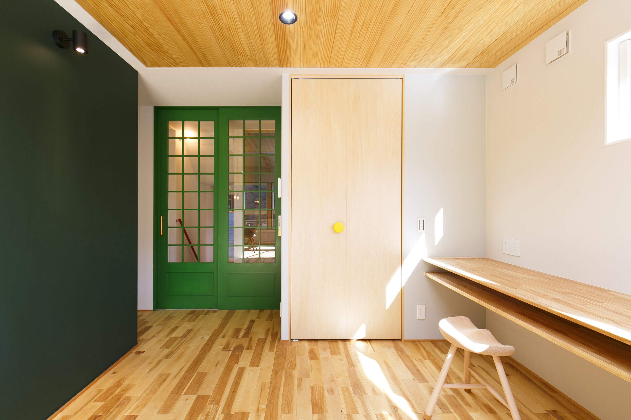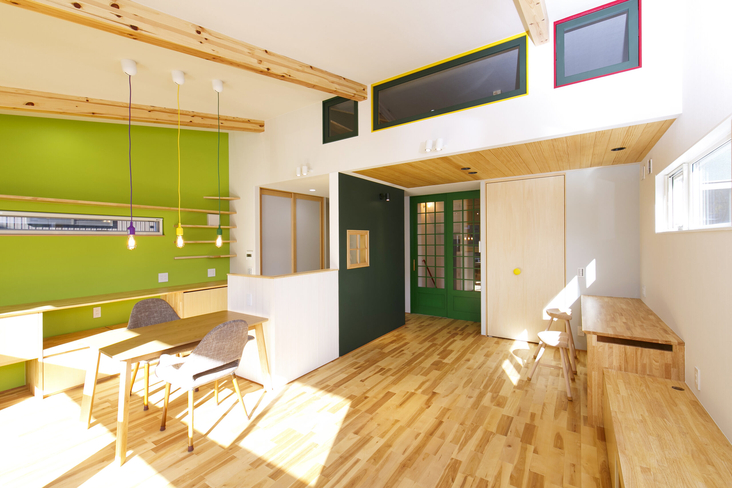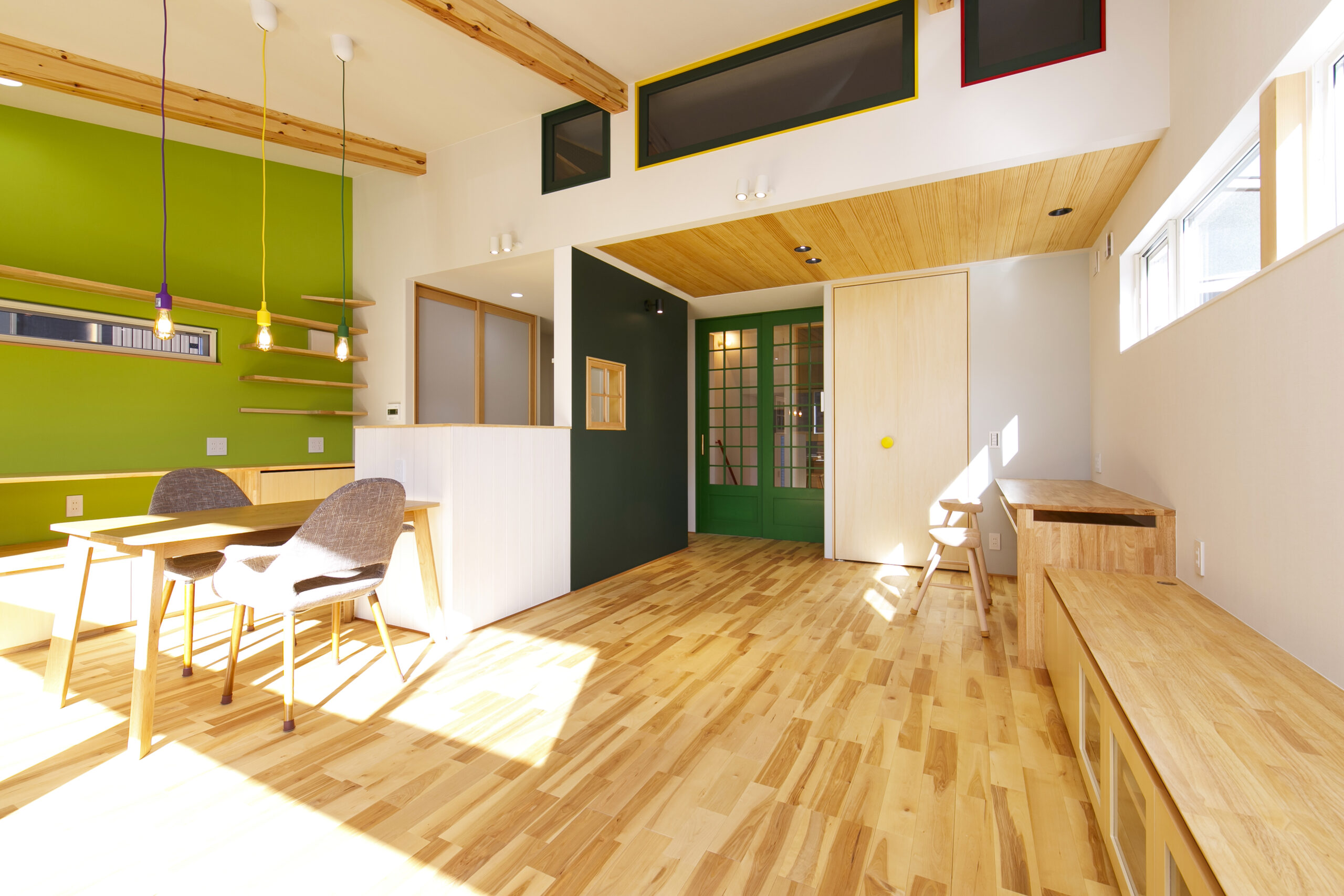 アクセントにグリーンを効かせ、木の天井材や造作家具が印象的な空間。オーナーが好きなカラフルでポップな要素を家づくりに積極的に取り入れました。敷地面積31.94坪というコンパクトな条件の中で、LDKを2階に配置することで、室内はもちろん外構にもゆとりが生まれるよう工夫しています。2階リビングならではの高さのある勾配天井やロフト、周囲の視線を気にせず過ごせるプライバシー性の高い住空間も大きな魅力です。オリジナルで製作した造作家具や建具は、オーナーと何度もデザインを重ねながら形にしたもの。周りとはかぶらない特別な空間は、まさにオーダーメイドの神髄ともいえる住まいです。遊び心が住まい全体に反映された、毎日の暮らしが楽しくなる一邸となりました。