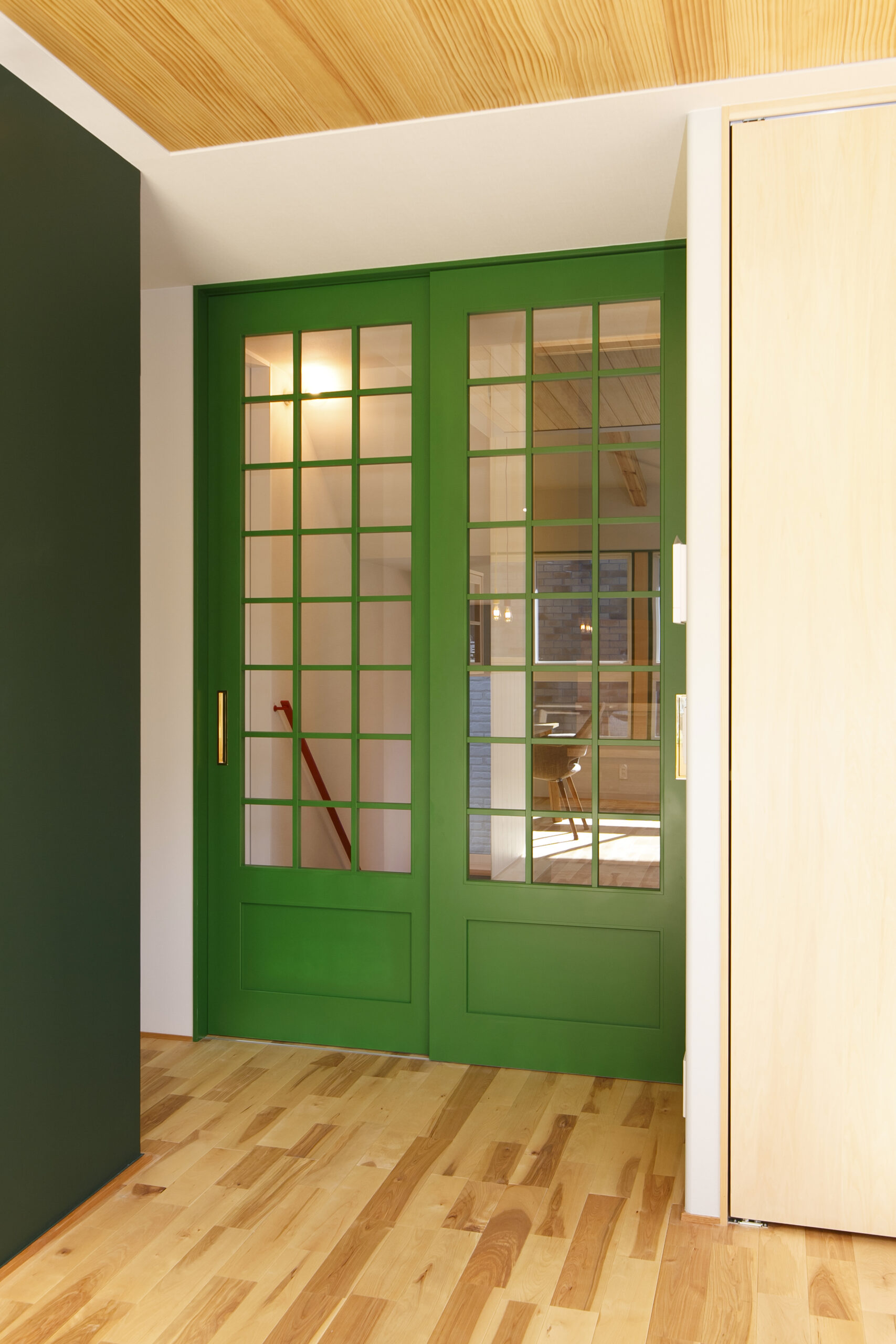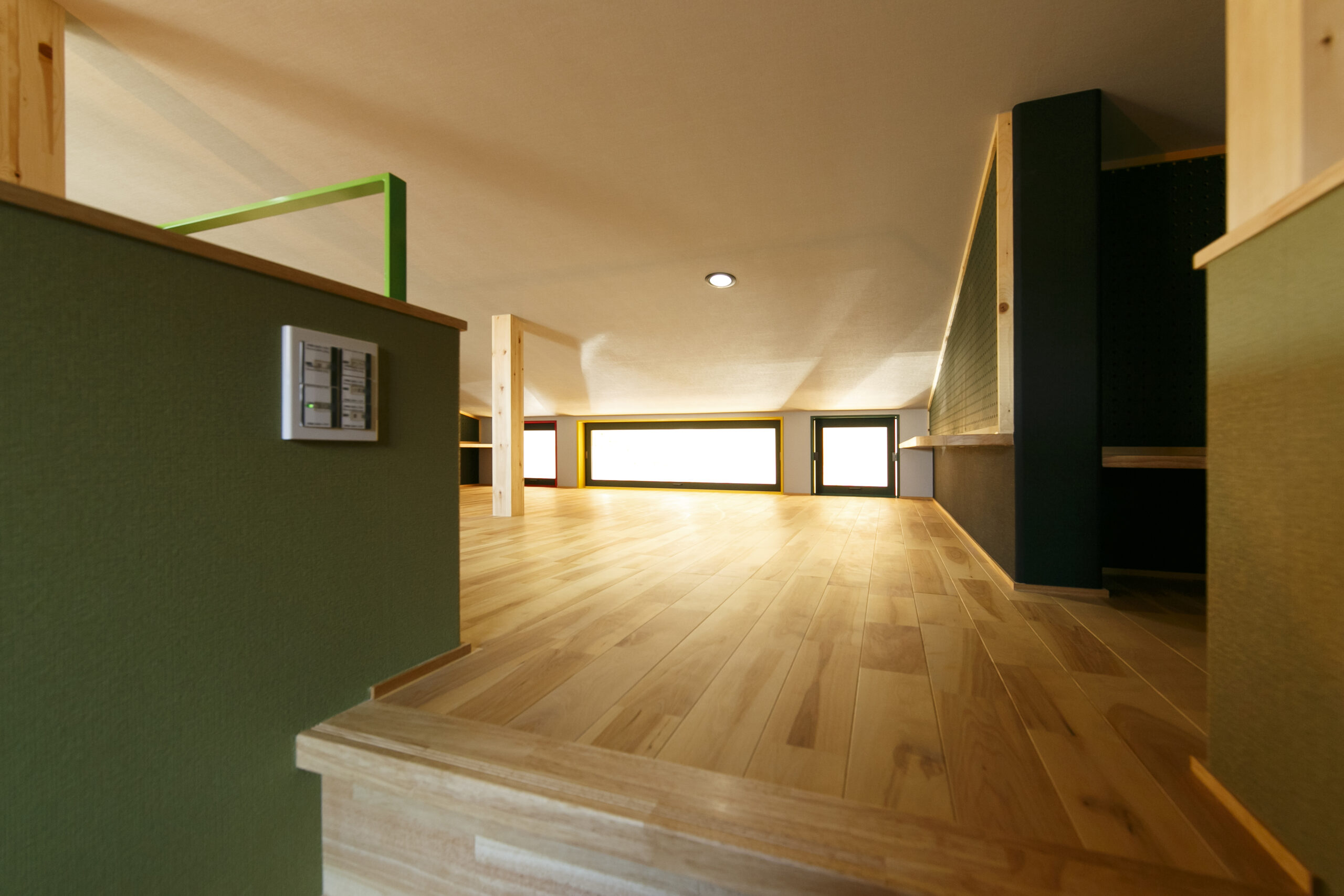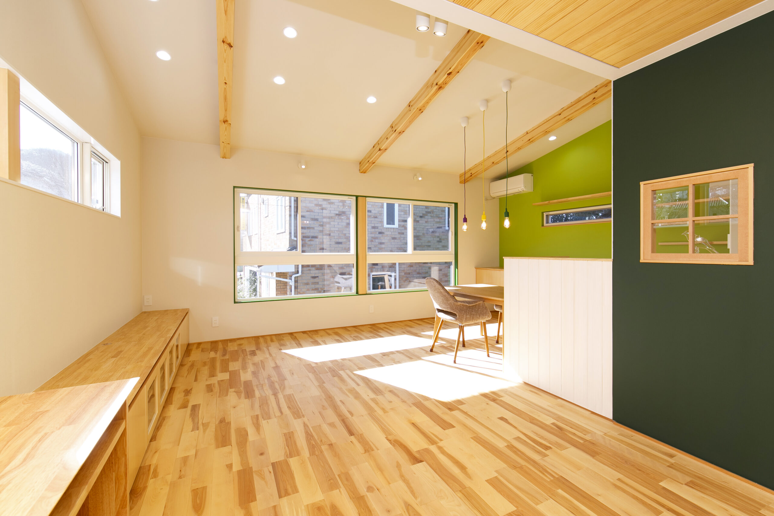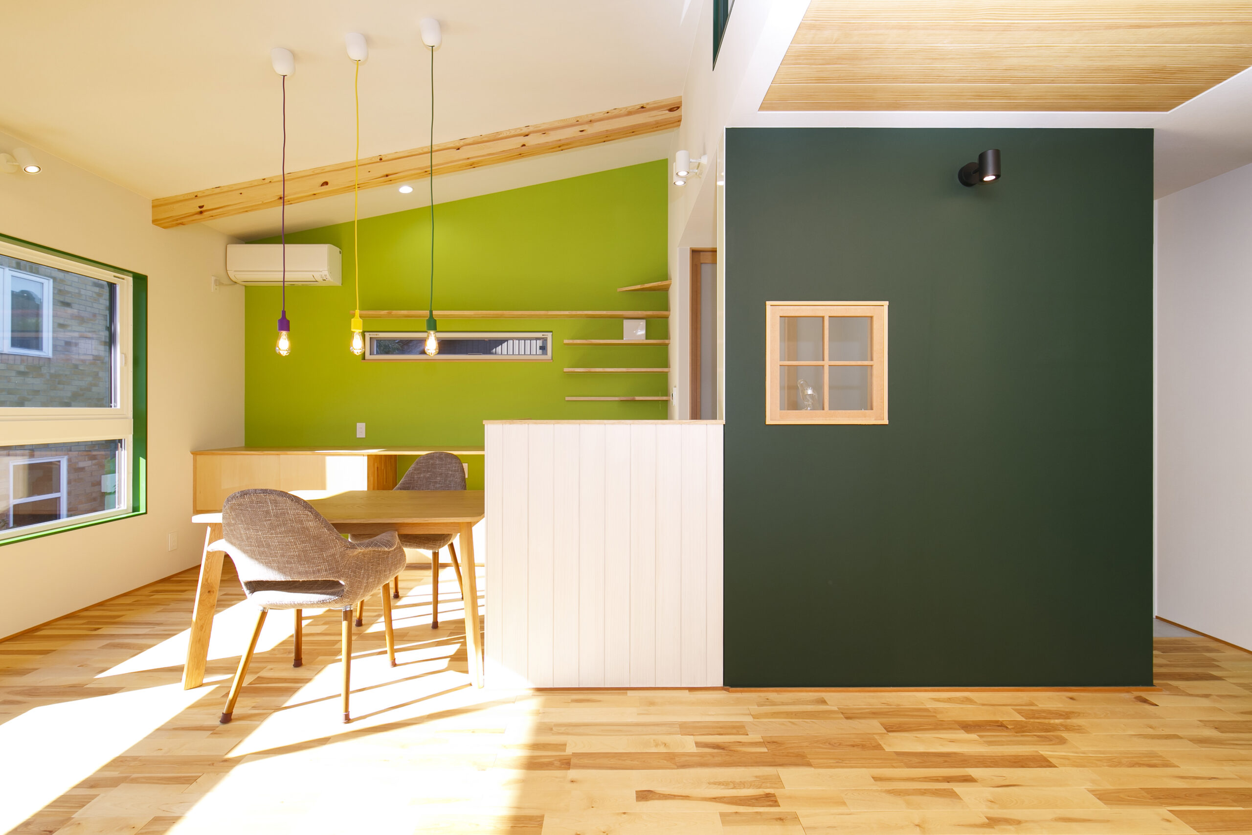 アクセントにグリーンを効かせ、木の天井材や造作家具が印象的な空間。オーナーが好きなカラフルでポップな要素を家づくりに積極的に取り入れました。敷地面積31.94坪というコンパクトな条件の中で、LDKを2階に配置することで、室内はもちろん外構にもゆとりが生まれるよう工夫しています。2階リビングならではの高さのある勾配天井やロフト、周囲の視線を気にせず過ごせるプライバシー性の高い住空間も大きな魅力です。オリジナルで製作した造作家具や建具は、オーナーと何度もデザインを重ねながら形にしたもの。周りとはかぶらない特別な空間は、まさにオーダーメイドの神髄ともいえる住まいです。遊び心が住まい全体に反映された、毎日の暮らしが楽しくなる一邸となりました。
