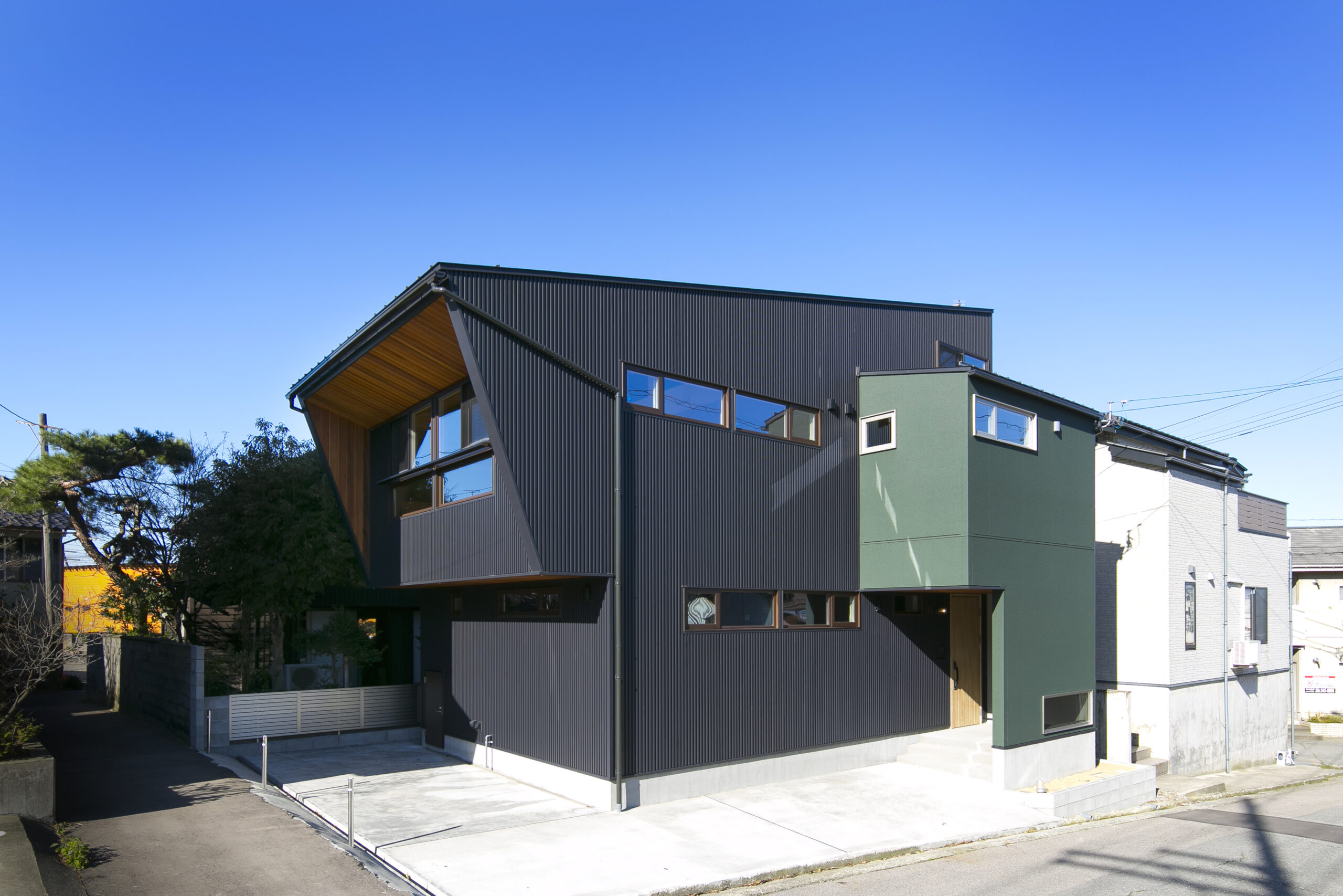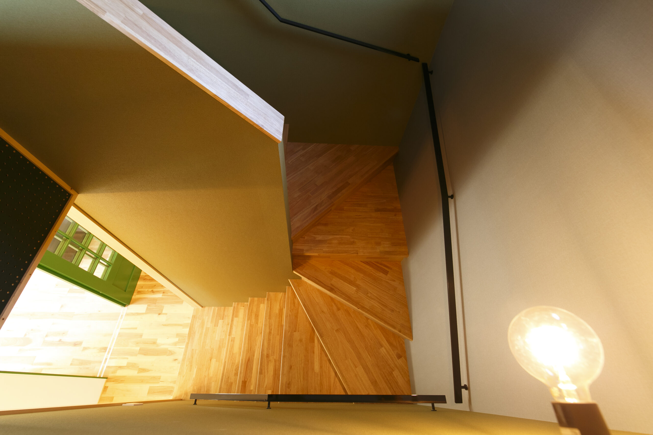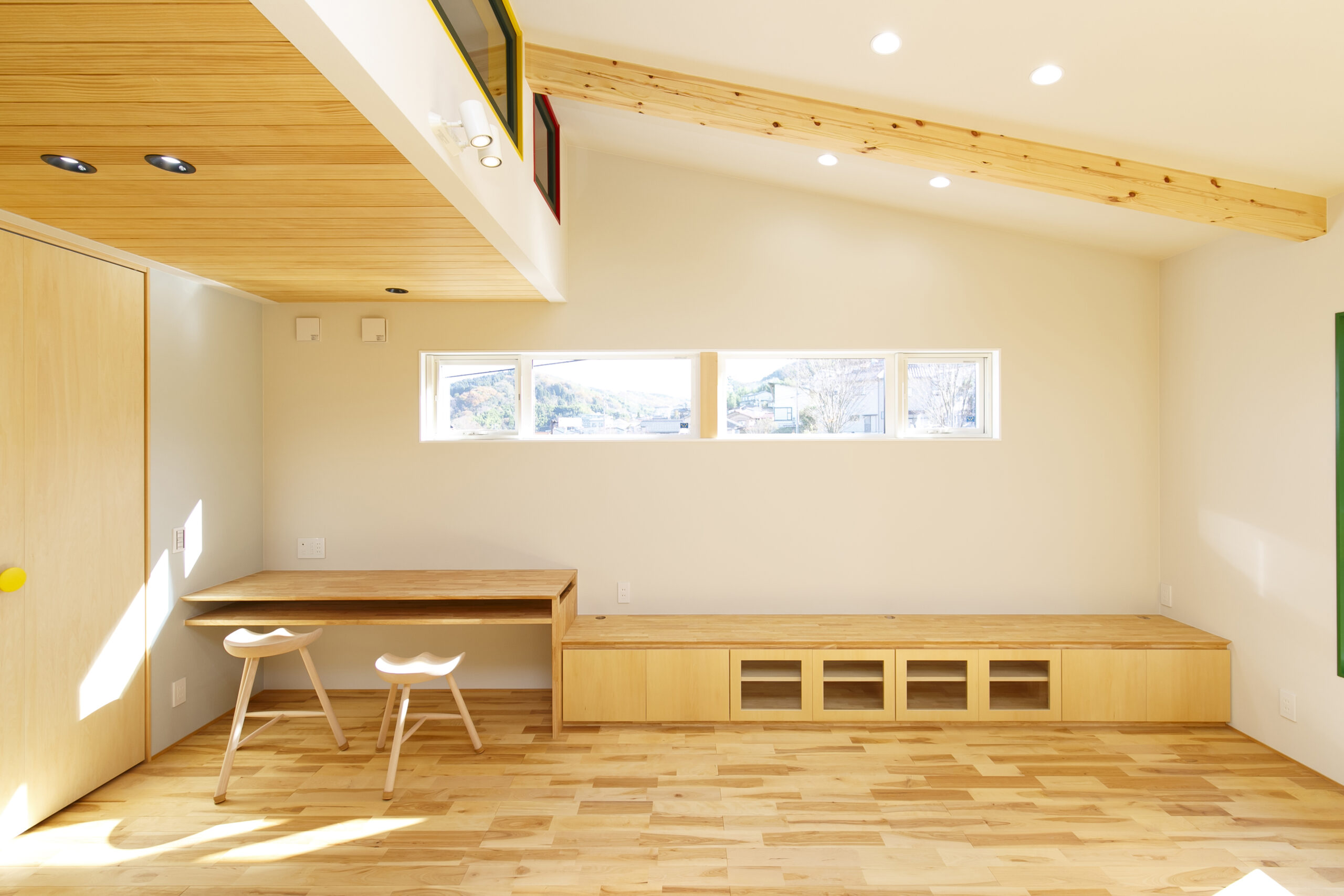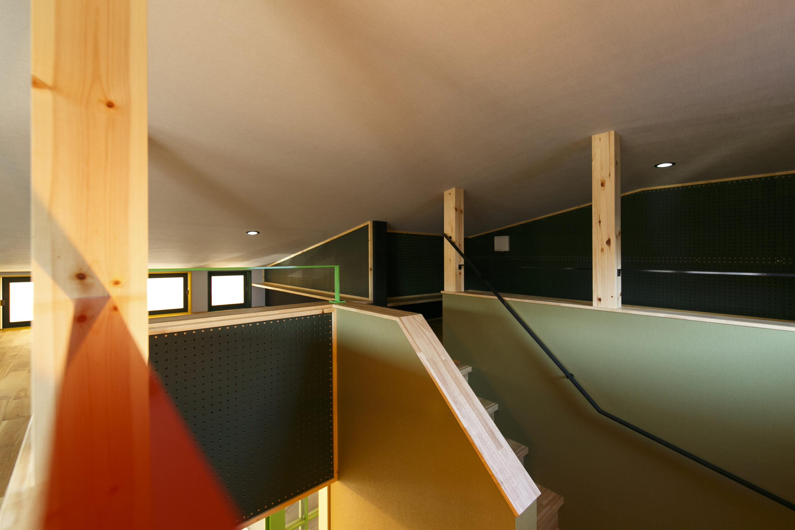 アクセントにグリーンを効かせ、木の天井材や造作家具が印象的な空間。オーナーが好きなカラフルでポップな要素を家づくりに積極的に取り入れました。敷地面積31.94坪というコンパクトな条件の中で、LDKを2階に配置することで、室内はもちろん外構にもゆとりが生まれるよう工夫しています。2階リビングならではの高さのある勾配天井やロフト、周囲の視線を気にせず過ごせるプライバシー性の高い住空間も大きな魅力です。オリジナルで製作した造作家具や建具は、オーナーと何度もデザインを重ねながら形にしたもの。周りとはかぶらない特別な空間は、まさにオーダーメイドの神髄ともいえる住まいです。遊び心が住まい全体に反映された、毎日の暮らしが楽しくなる一邸となりました。