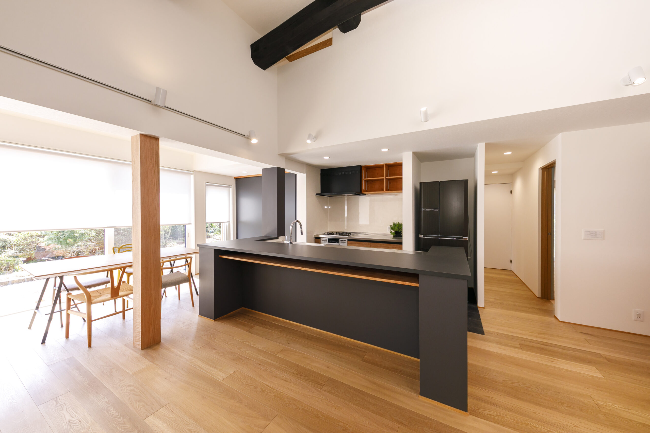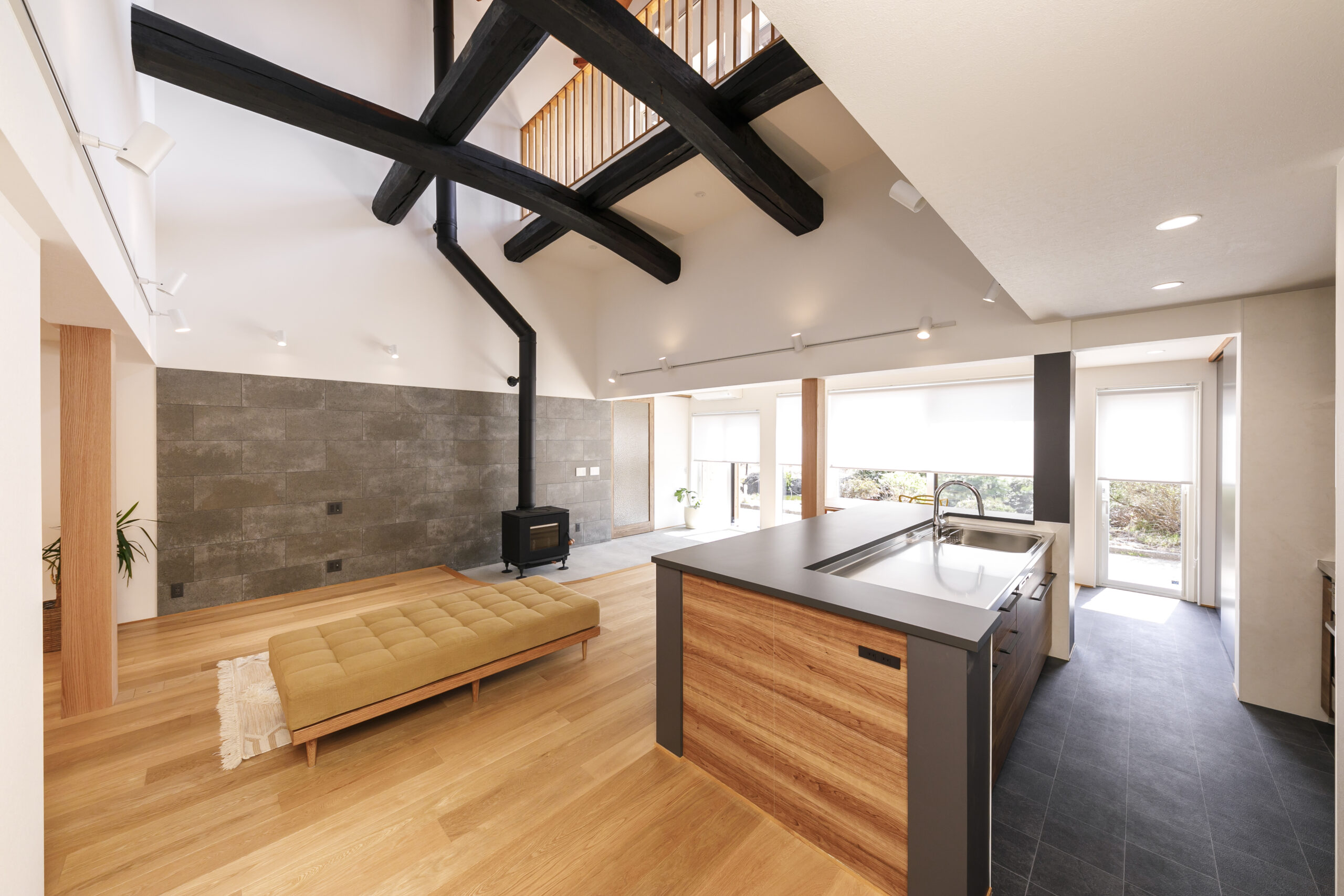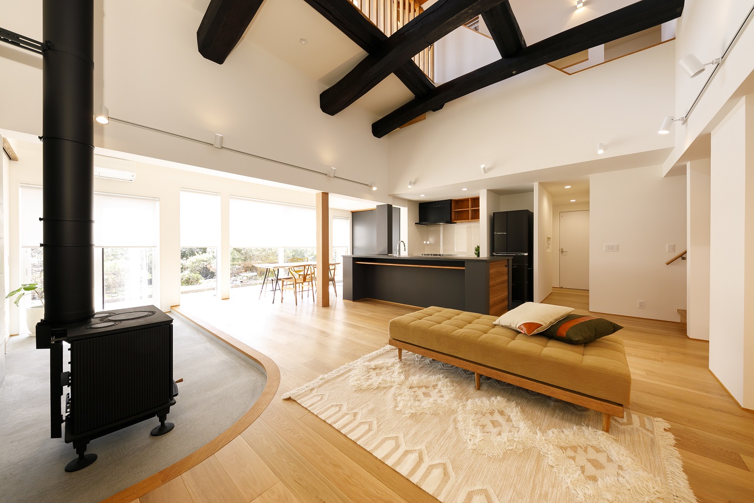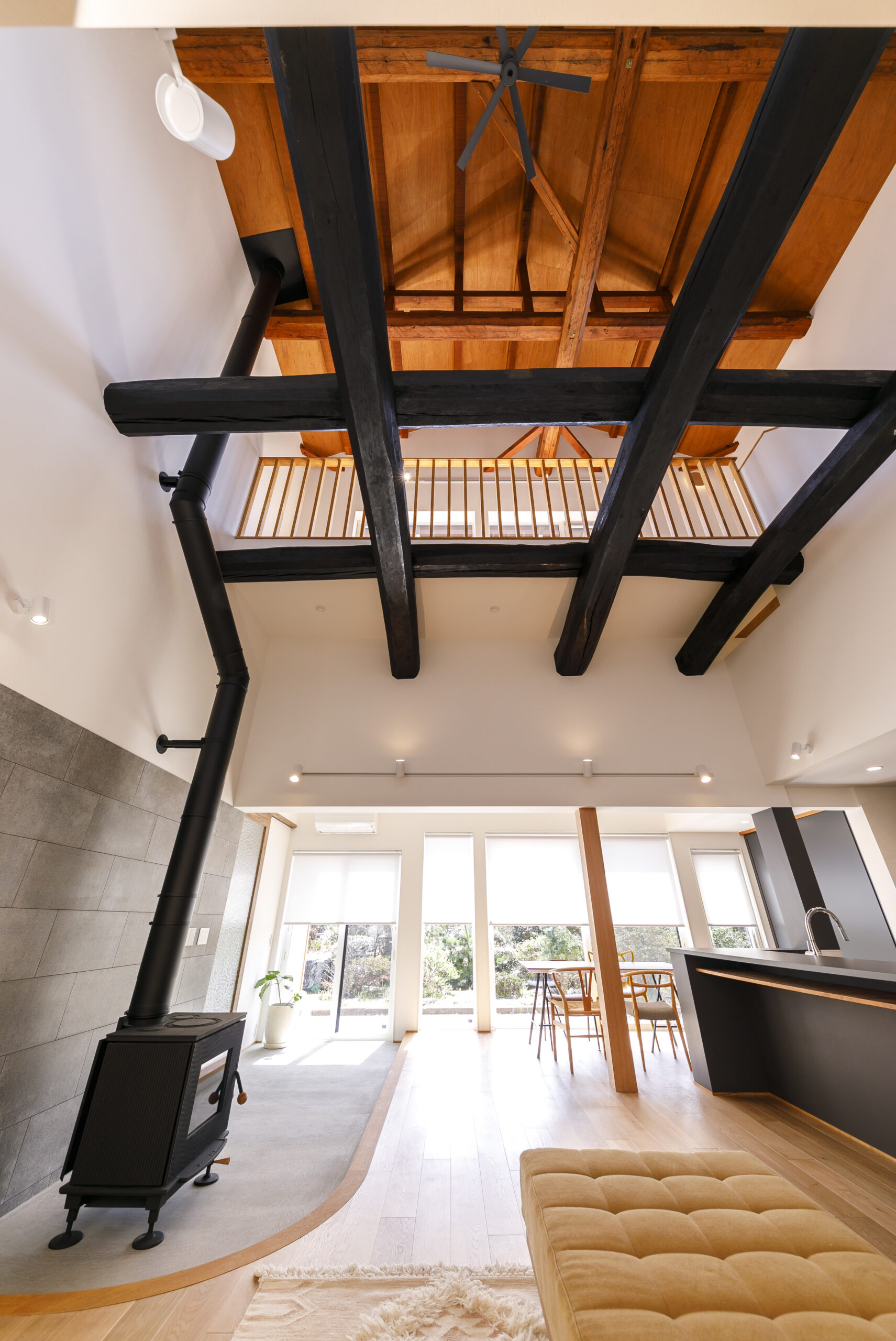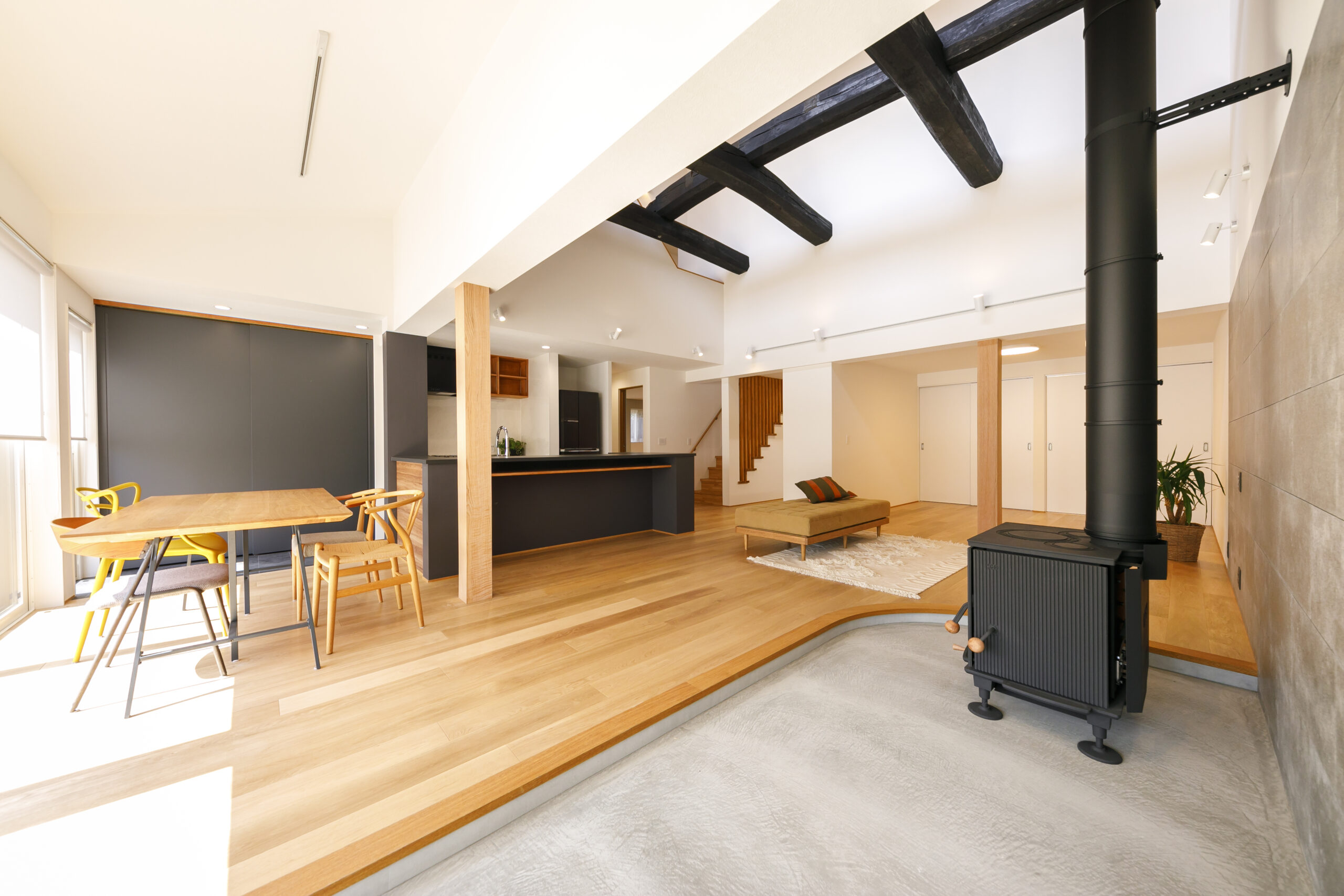 ご家族から受け継がれた大切な住まい。元々の躯体や梁を利用した、広い中土間のあるLDKは外とのつながりを感じられる開放的な吹抜け空間。