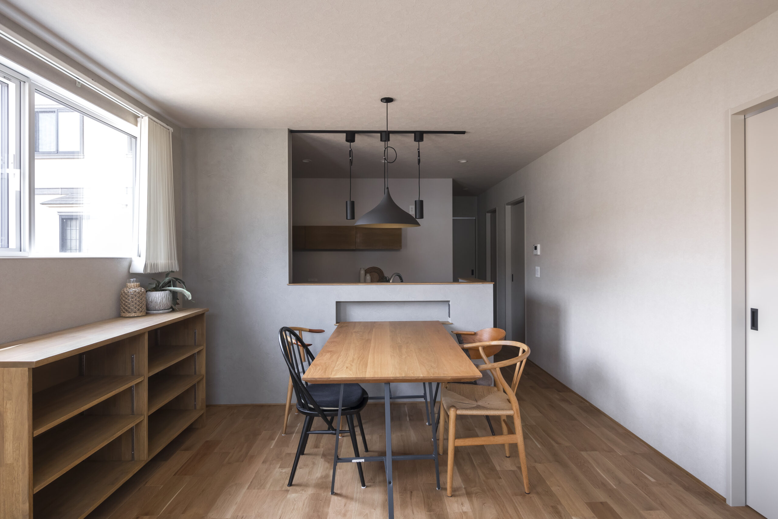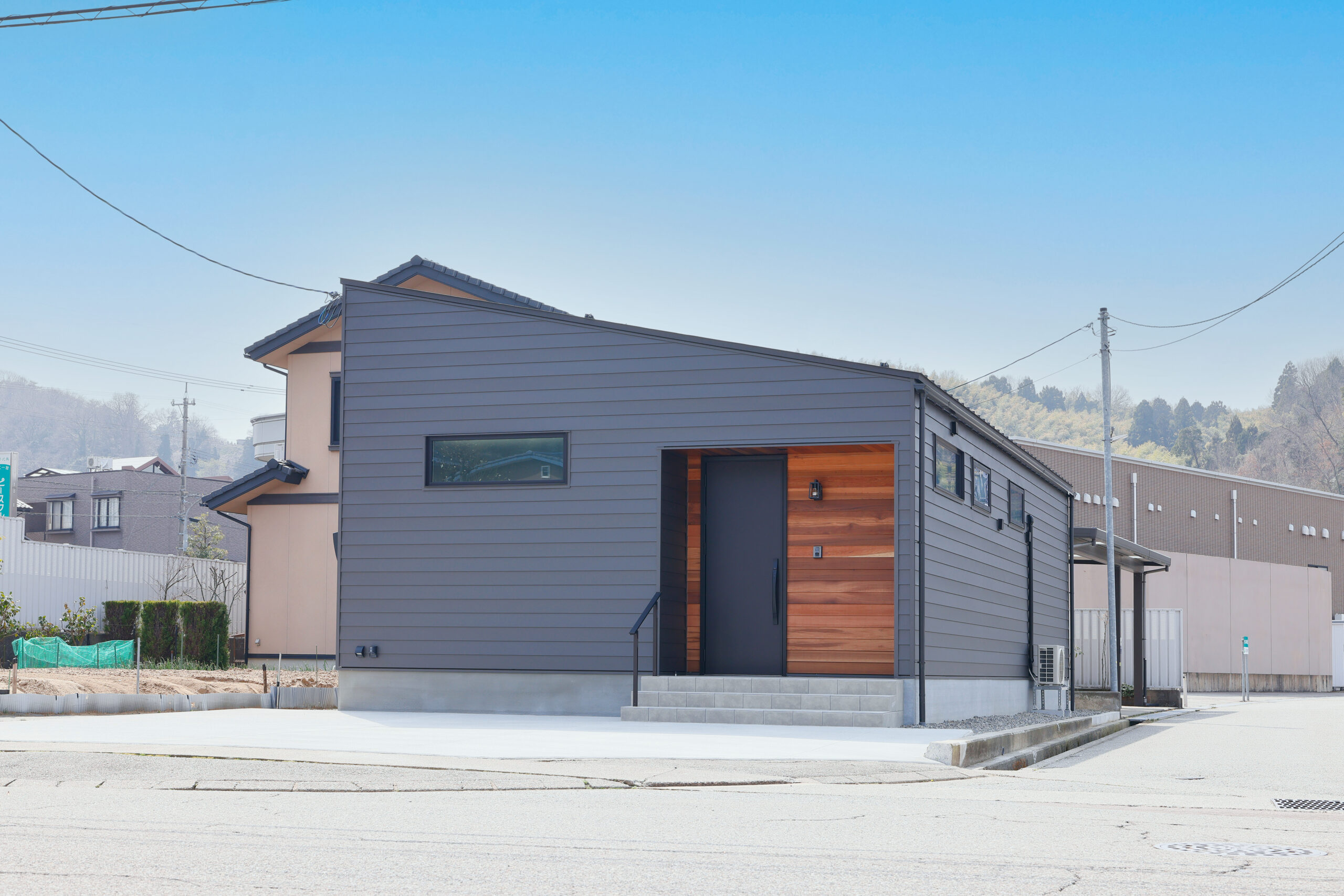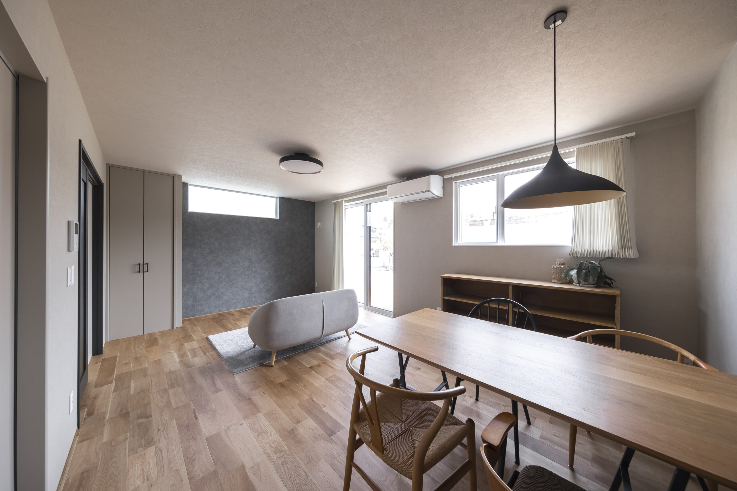 できるだけシンプルに、そして心地よく。夫婦二人で住まう、平屋ならではのコンパクトさと暮らしやすさを大切にした住まいです。間取りはLDKを中心に、各部屋へ無理なくアクセスできる動線とし、日々の生活が自然に整うよう計画しました。床にはナラの無垢フローリングを採用し、足元から伝わる木の温もりを感じられる空間に。壁面はグレーをベースに、アクセントとして黒を取り入れることで、落ち着きのあるシックモダンな雰囲気を演出しています。住まいの名前「Fika」は、北欧の文化に由来し、「ひと息つく」「大切な人との時間を楽しむ」といった意味を持つ言葉。忙しい日常の中でも、夫婦がゆっくりと暮らしを味わい、心豊かな時間を重ねていける——そんな想いを込めた住まいが完成しました。