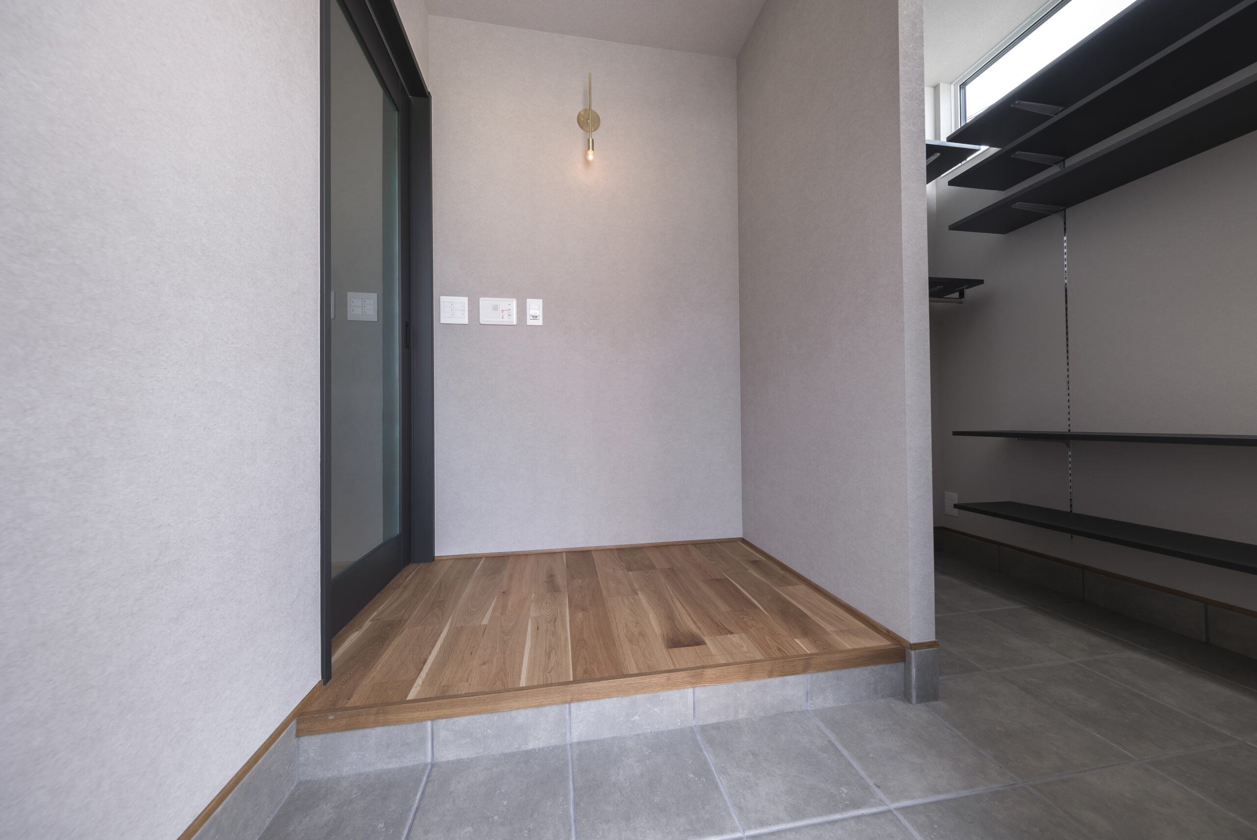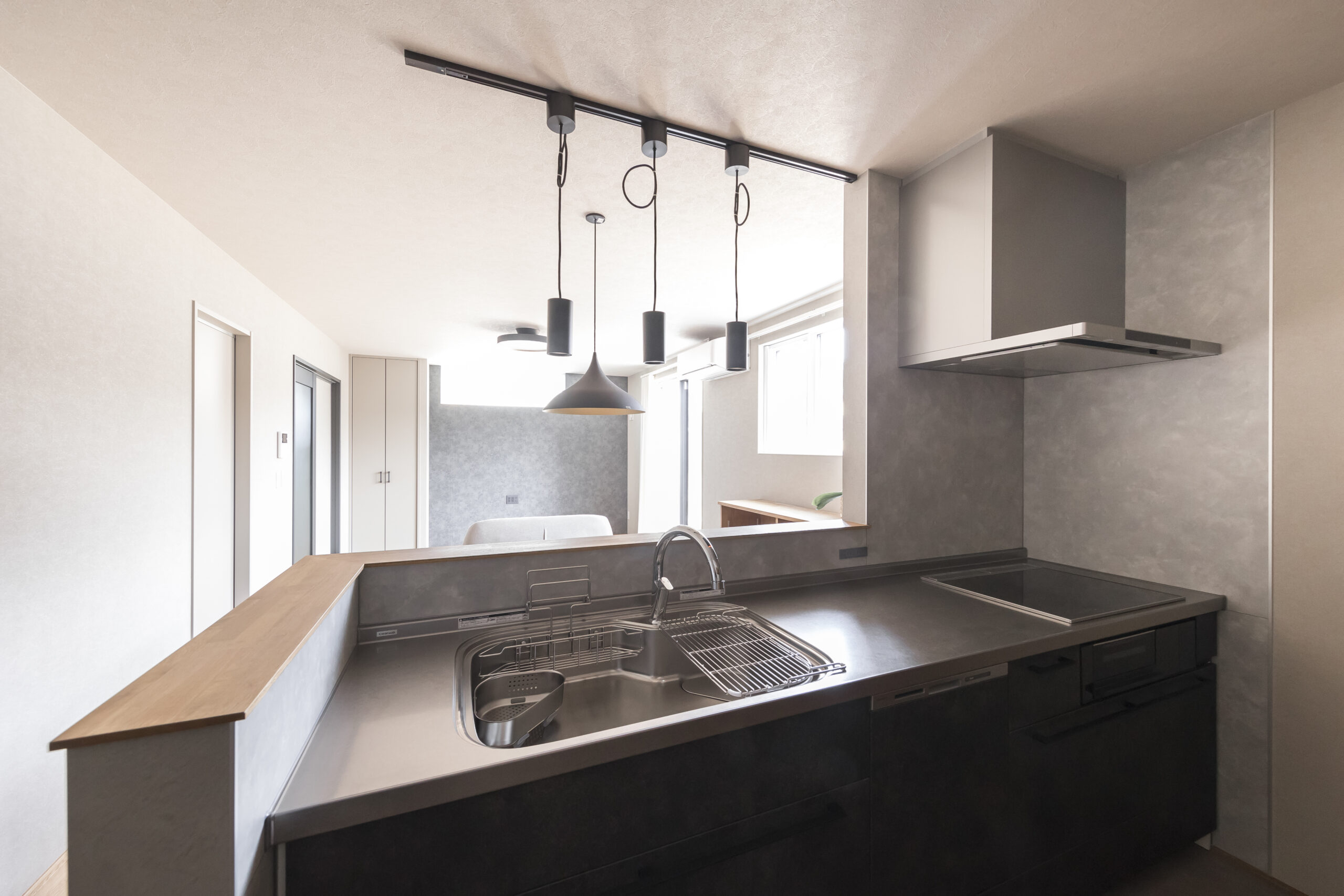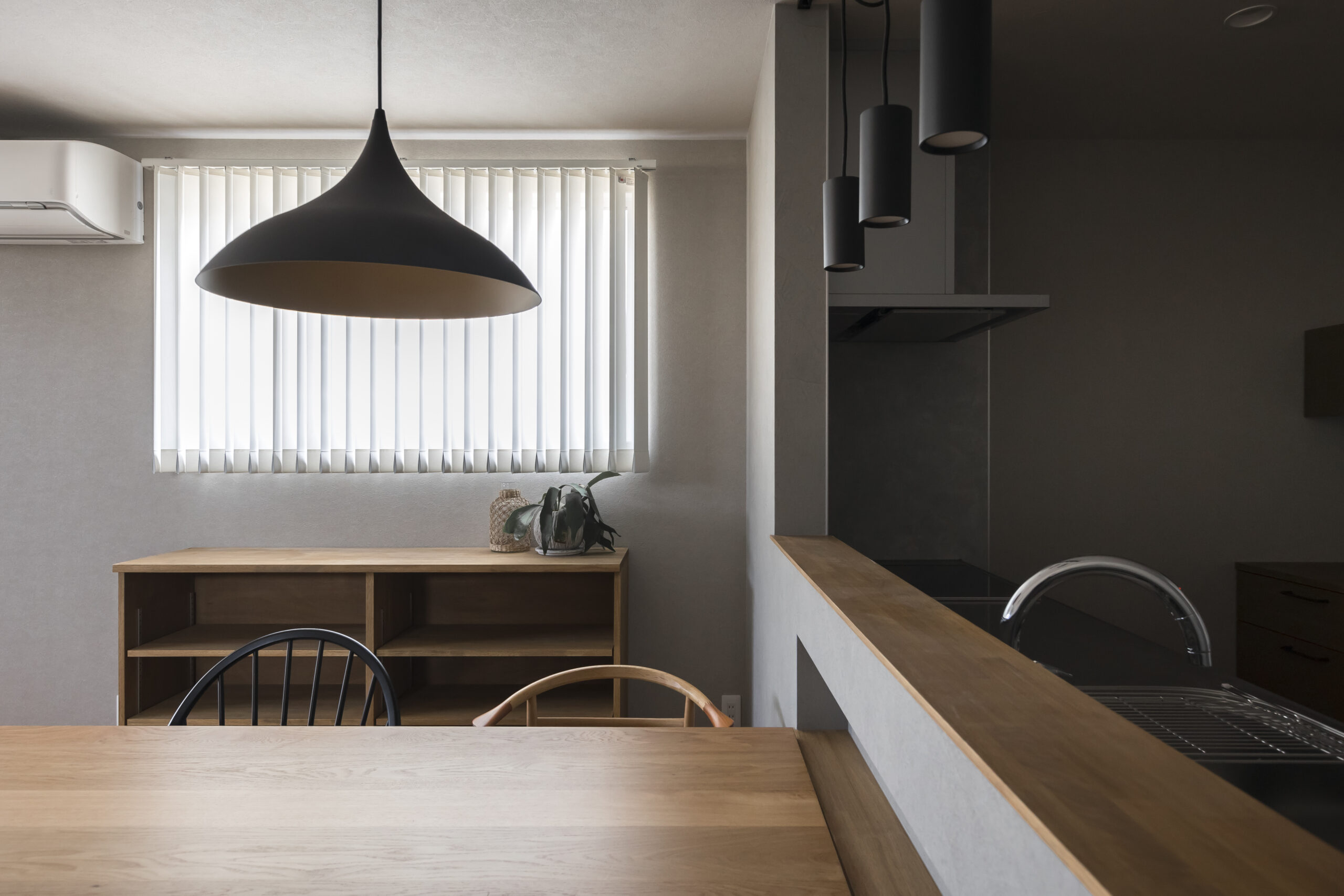 できるだけシンプルに、そして心地よく。夫婦二人で住まう、平屋ならではのコンパクトさと暮らしやすさを大切にした住まいです。間取りはLDKを中心に、各部屋へ無理なくアクセスできる動線とし、日々の生活が自然に整うよう計画しました。床にはナラの無垢フローリングを採用し、足元から伝わる木の温もりを感じられる空間に。壁面はグレーをベースに、アクセントとして黒を取り入れることで、落ち着きのあるシックモダンな雰囲気を演出しています。住まいの名前「Fika」は、北欧の文化に由来し、「ひと息つく」「大切な人との時間を楽しむ」といった意味を持つ言葉。忙しい日常の中でも、夫婦がゆっくりと暮らしを味わい、心豊かな時間を重ねていける——そんな想いを込めた住まいが完成しました。