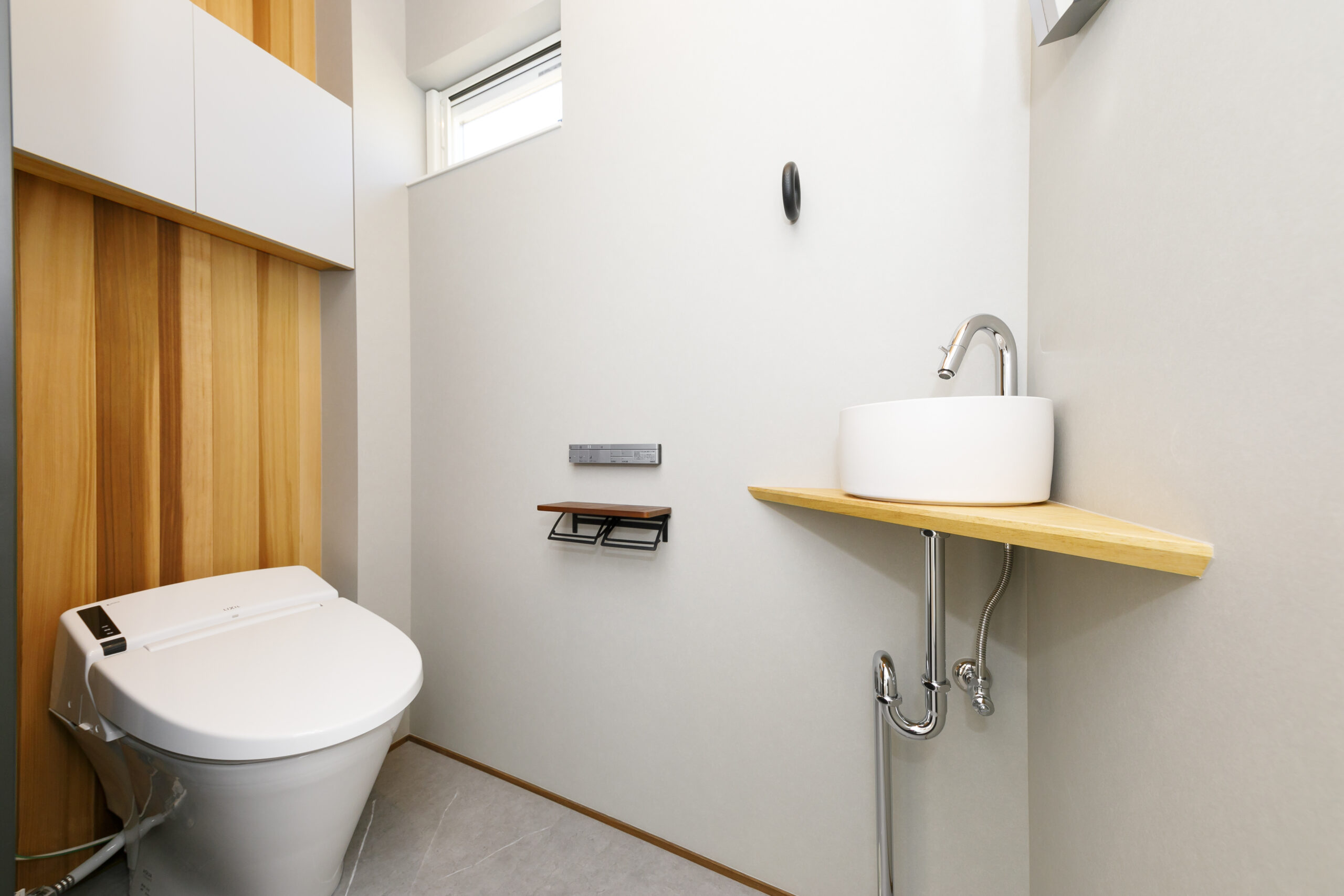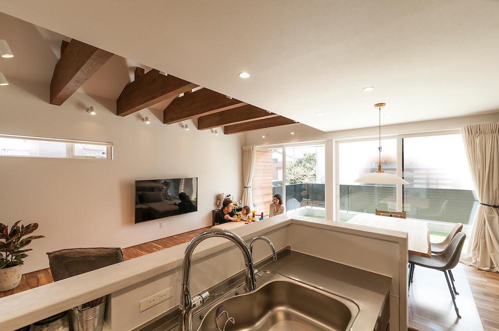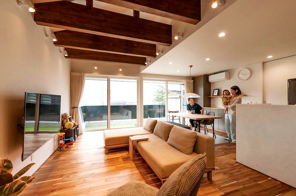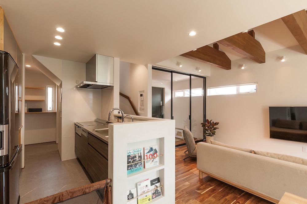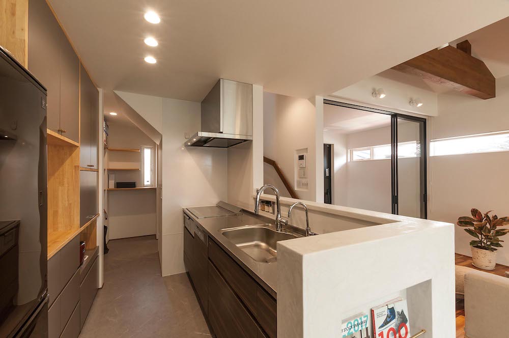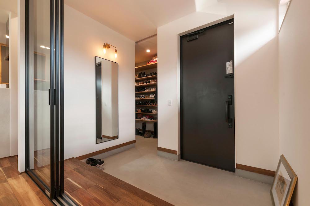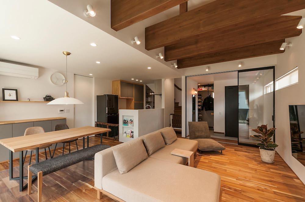 昔ながらの街並みに出現したフレッシュな建物。それでいて、落ち着いた色遣いや素材感、フォルムが、心地よく周囲に溶け込んでいます。玄関土間に入ると正面にLDKが広がり、その先の庭まで視線が抜ける開放的な空間構成。右側に視線を移すと、揃って靴好きというご夫婦のアイテムが整然と並ぶシューズクローク。そこから水回りをぐるりと回遊できる間取りです。アカシアの無垢フローリングに、スタイリッシュな置き家具や造作家具を組み合わせた室内。まるでショーウィンドウのように、訪れる人の目と心を楽しませてくれる住まいです。