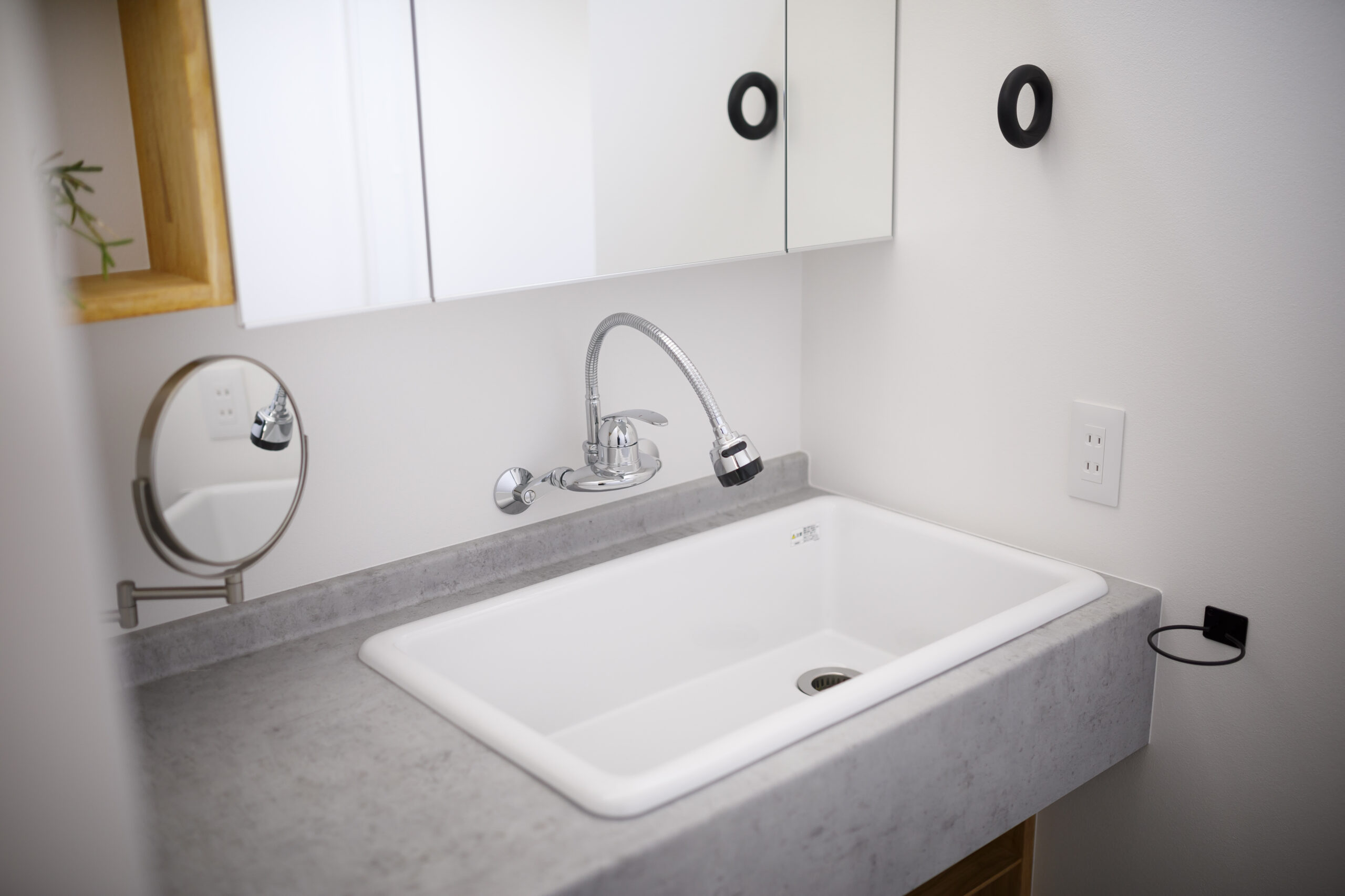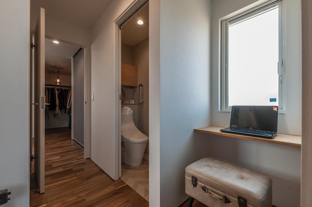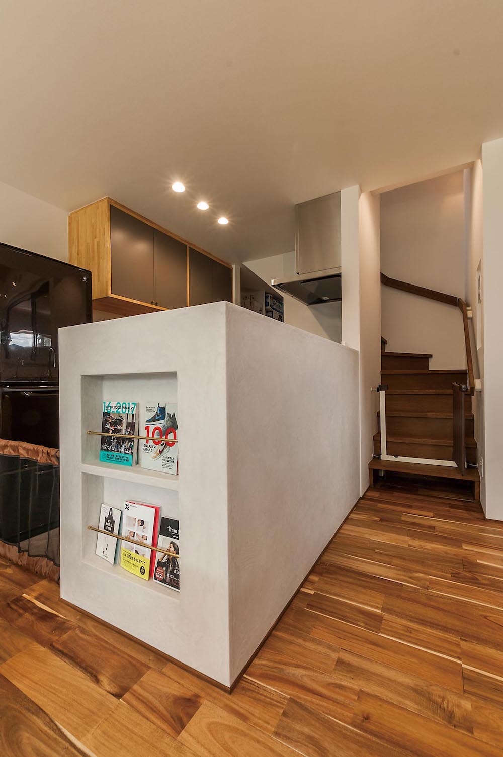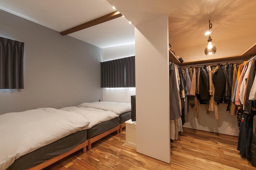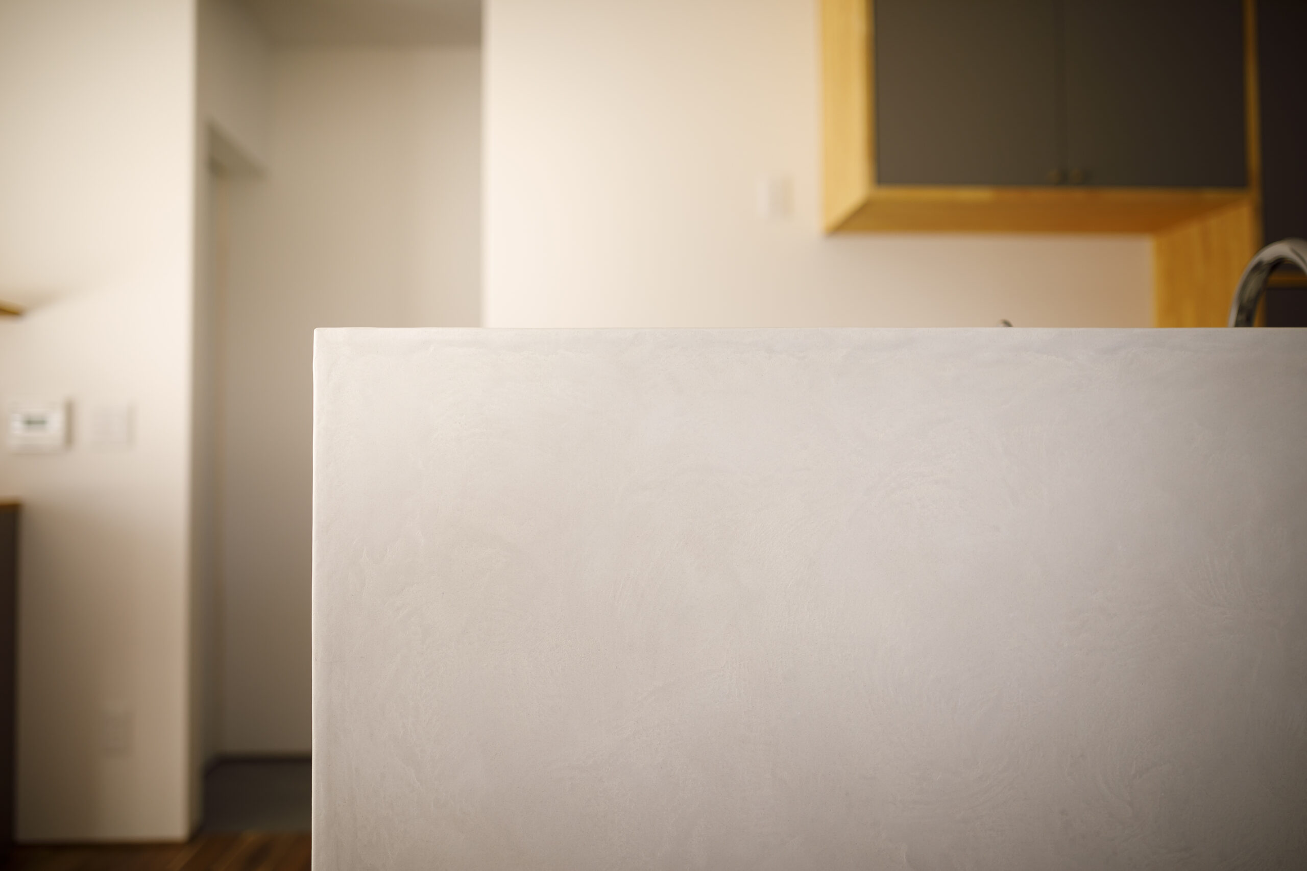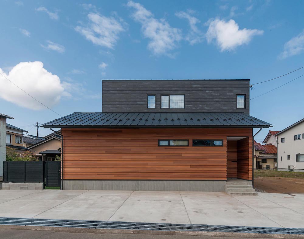 昔ながらの街並みに出現したフレッシュな建物。それでいて、落ち着いた色遣いや素材感、フォルムが、心地よく周囲に溶け込んでいます。玄関土間に入ると正面にLDKが広がり、その先の庭まで視線が抜ける開放的な空間構成。右側に視線を移すと、揃って靴好きというご夫婦のアイテムが整然と並ぶシューズクローク。そこから水回りをぐるりと回遊できる間取りです。アカシアの無垢フローリングに、スタイリッシュな置き家具や造作家具を組み合わせた室内。まるでショーウィンドウのように、訪れる人の目と心を楽しませてくれる住まいです。