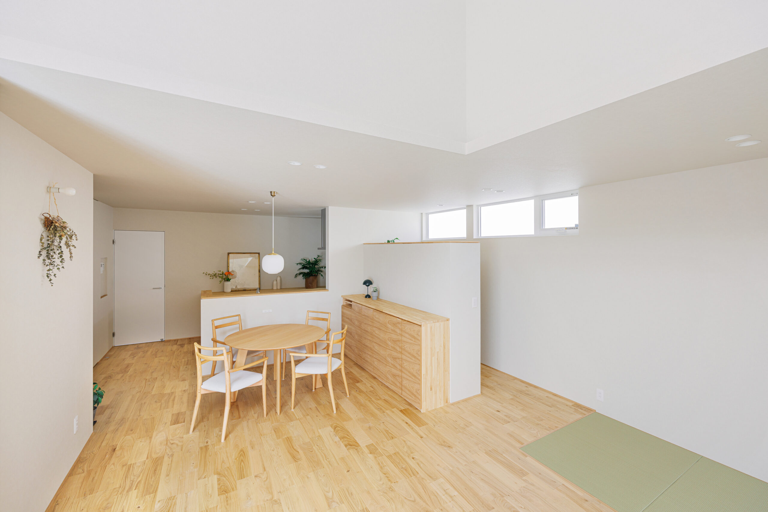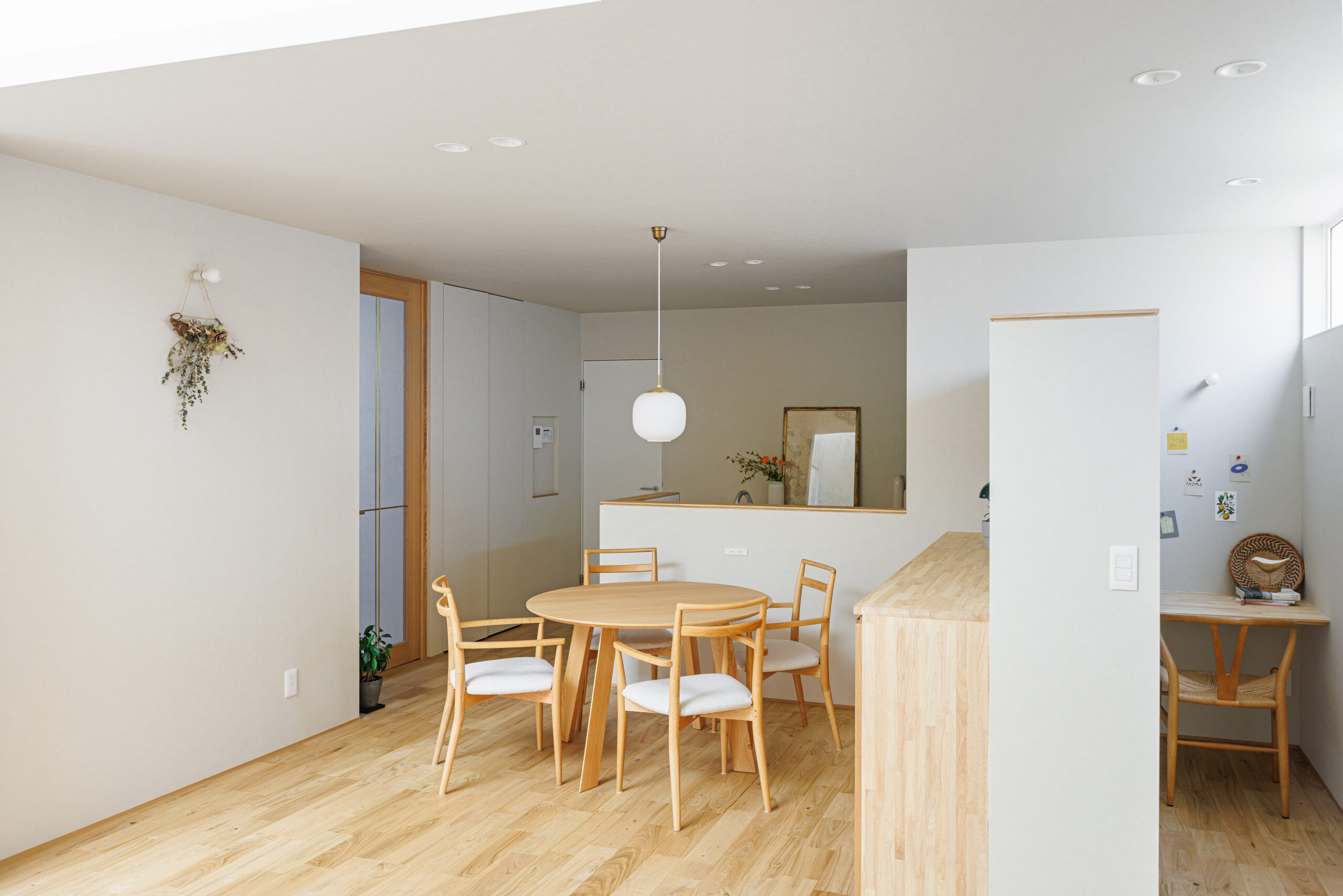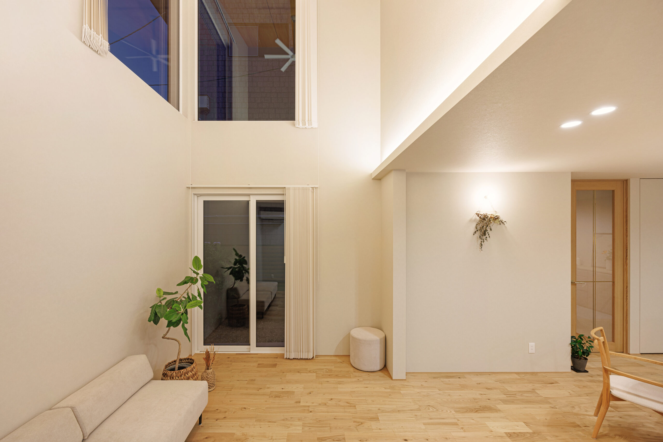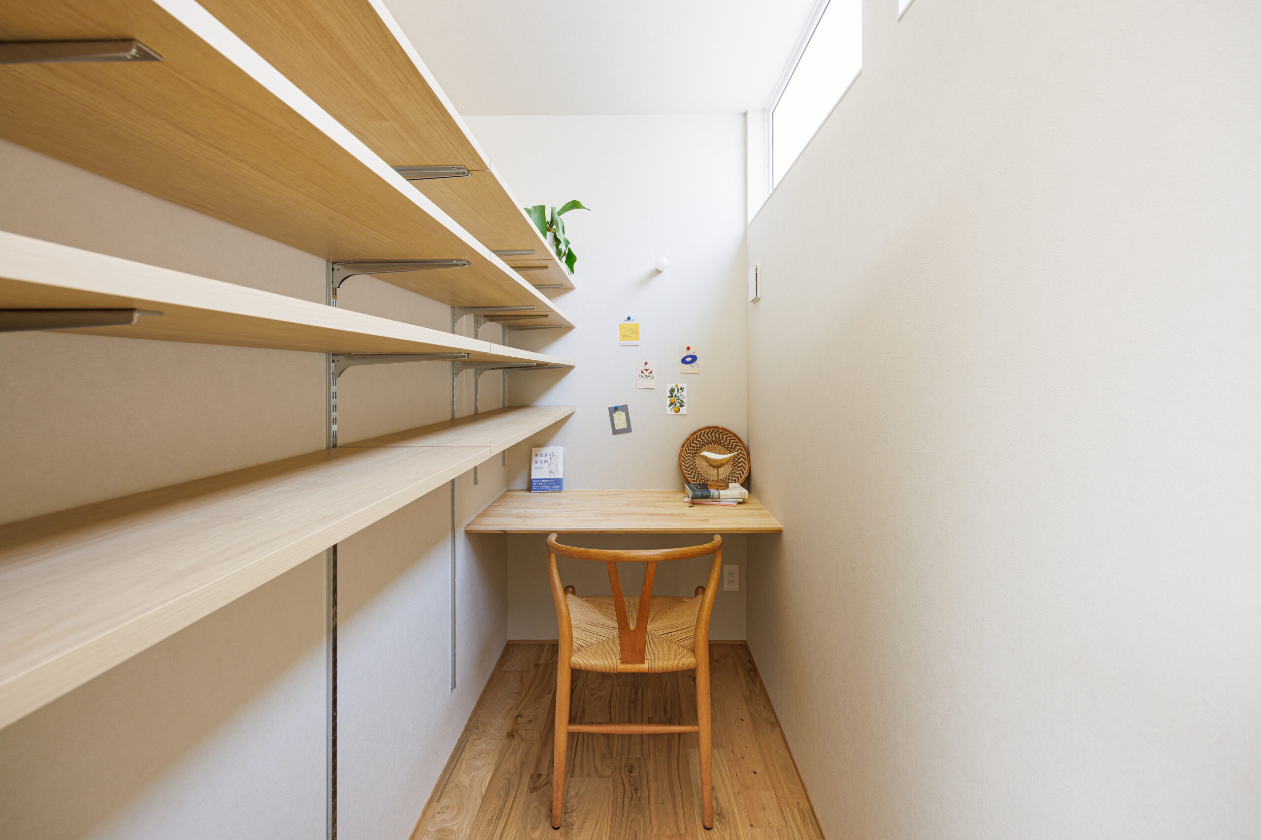 自然素材のやさしさをまとった空間には、家族の時間をより心地よく、豊かに包み込むための工夫が随所に散りばめられています。外観には、上質で落ち着いた表情を持つジョリパットの塗り壁を採用し、街並みにやさしく溶け込みながらも、品のある存在感を放つ佇まいに仕上げました。室内へ一歩足を踏み入れると、大きな吹き抜けから降り注ぐやわらかな光が空間全体を満たし、時間帯や季節によって移ろう光の表情を楽しむことができます。リビングの一角には、家族の気配を感じながらも程よい距離感を保てる高さで区切った書斎スペースを設け、仕事や読書、趣味の時間にも心地よく寄り添います。それぞれが自分の時間を大切にしながら、自然と家族がつながっていく——そんな暮らしのかたちを丁寧に描いた住まい。ここから始まる日々が、穏やかで実りあるものとなるよう、住まいそのものがやさしく支え続けます。