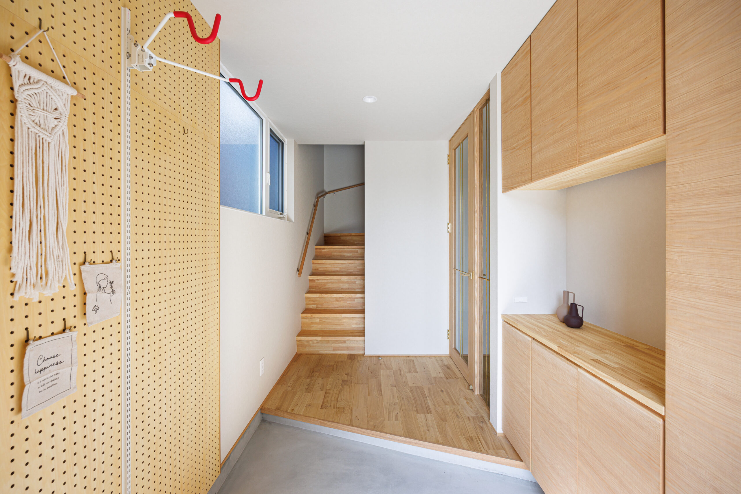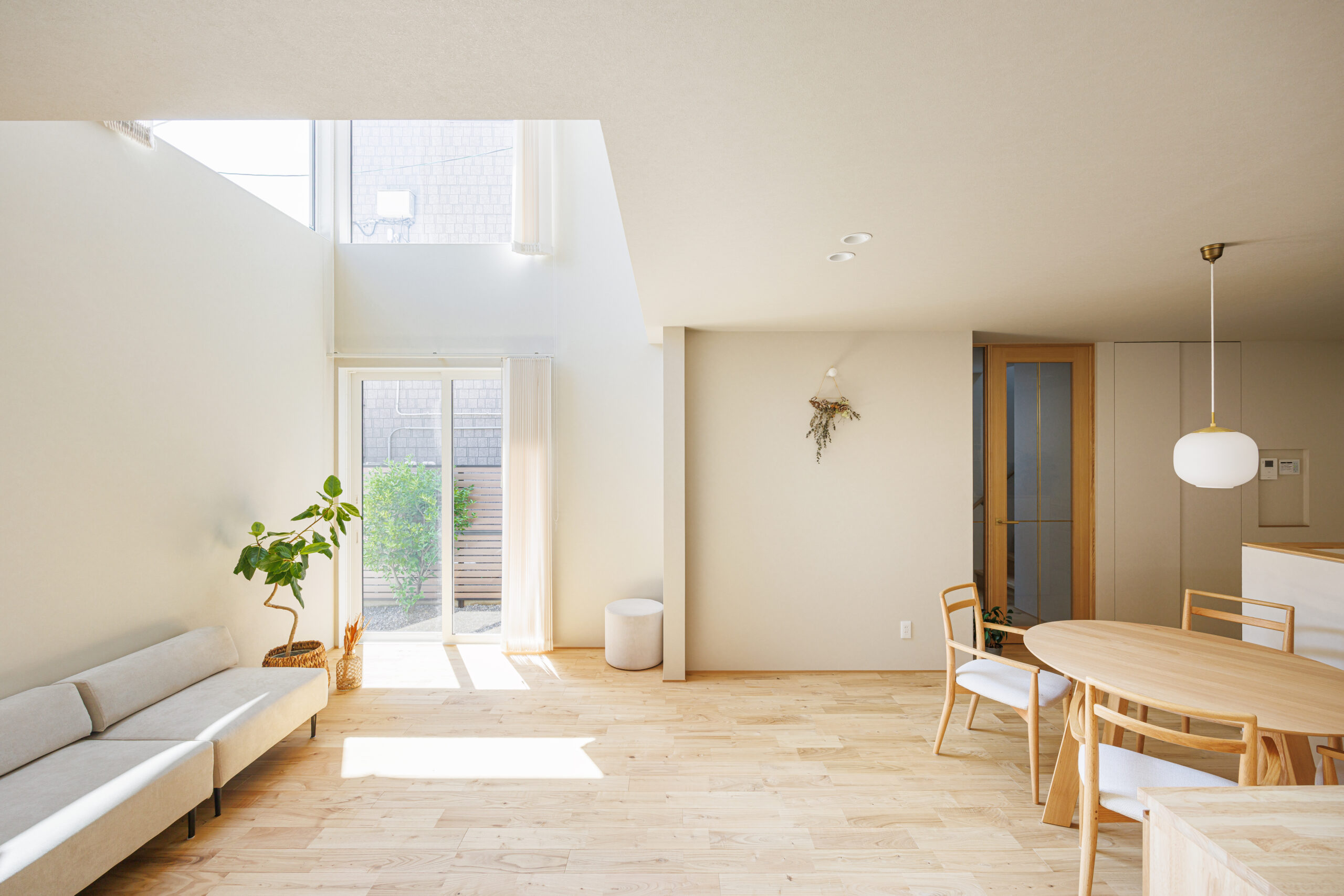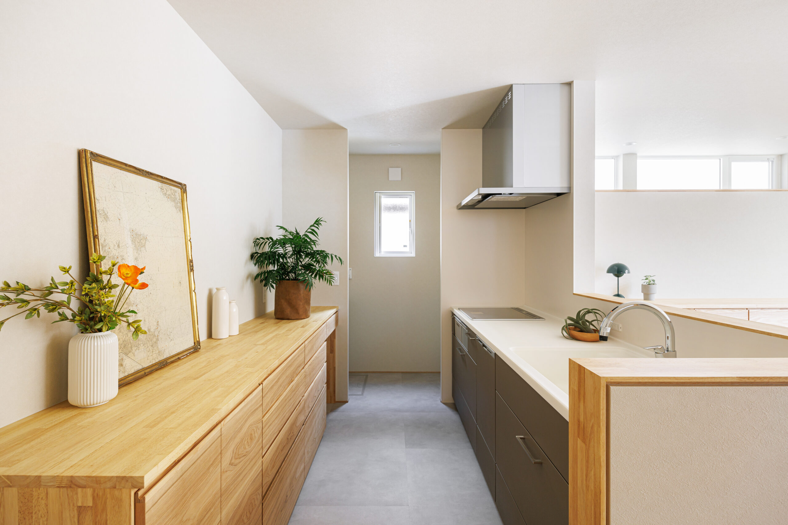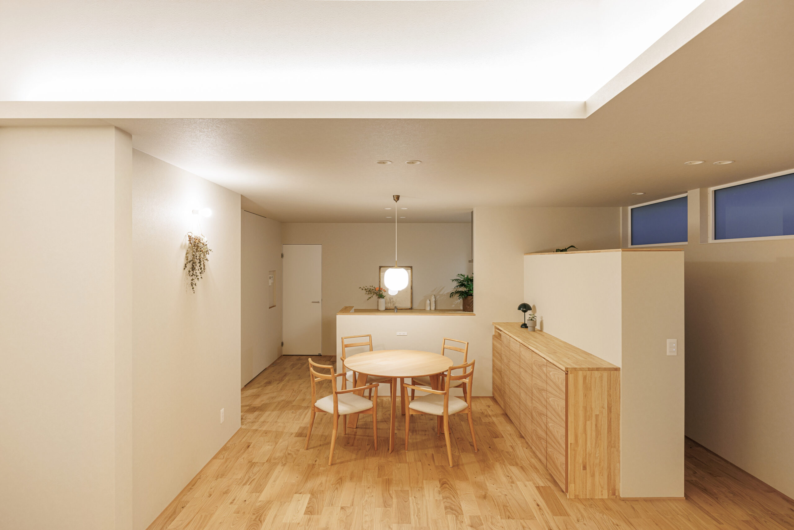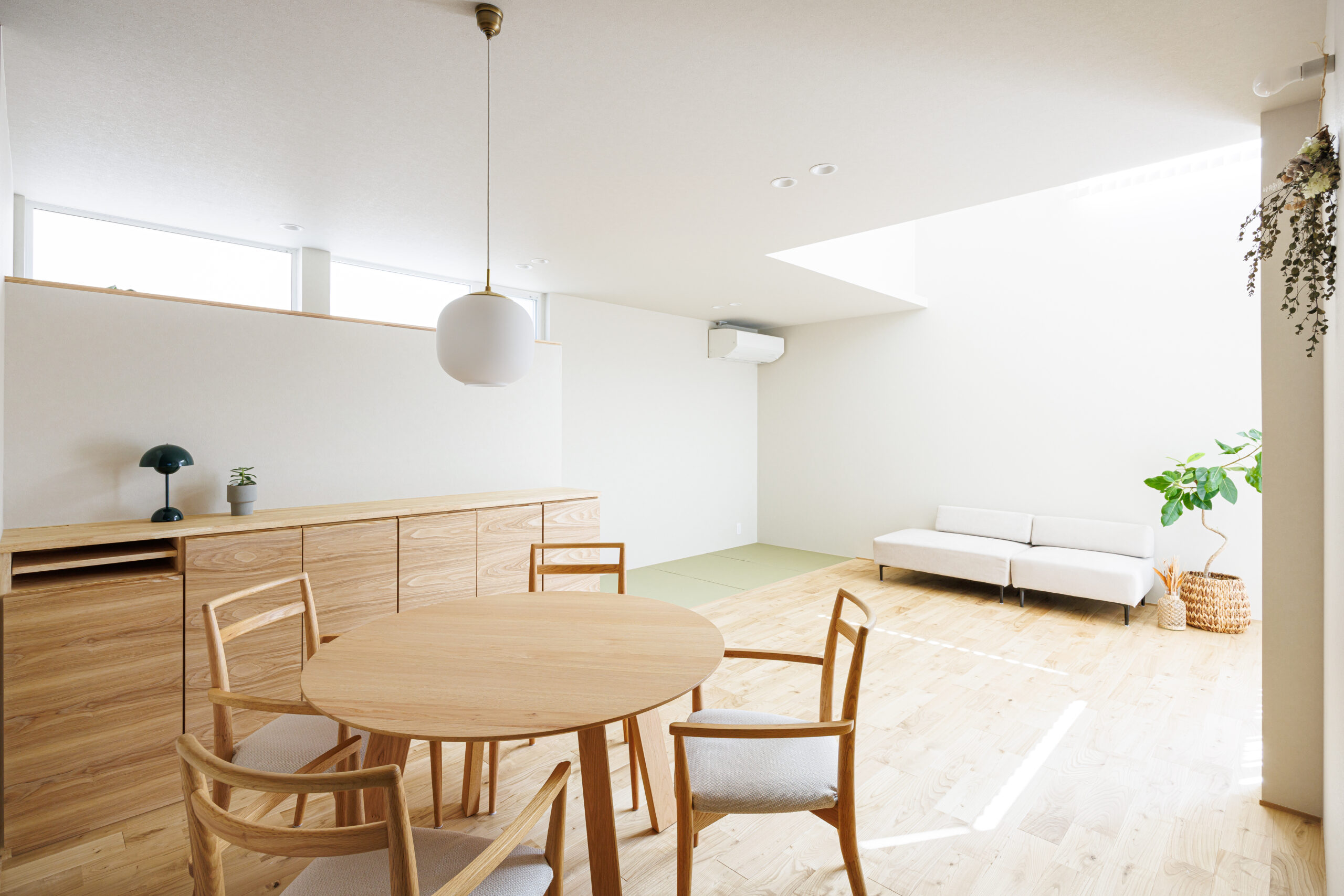 自然素材のやさしさをまとった空間には、家族の時間をより心地よく、豊かに包み込むための工夫が随所に散りばめられています。外観には、上質で落ち着いた表情を持つジョリパットの塗り壁を採用し、街並みにやさしく溶け込みながらも、品のある存在感を放つ佇まいに仕上げました。室内へ一歩足を踏み入れると、大きな吹き抜けから降り注ぐやわらかな光が空間全体を満たし、時間帯や季節によって移ろう光の表情を楽しむことができます。リビングの一角には、家族の気配を感じながらも程よい距離感を保てる高さで区切った書斎スペースを設け、仕事や読書、趣味の時間にも心地よく寄り添います。それぞれが自分の時間を大切にしながら、自然と家族がつながっていく——そんな暮らしのかたちを丁寧に描いた住まい。ここから始まる日々が、穏やかで実りあるものとなるよう、住まいそのものがやさしく支え続けます。