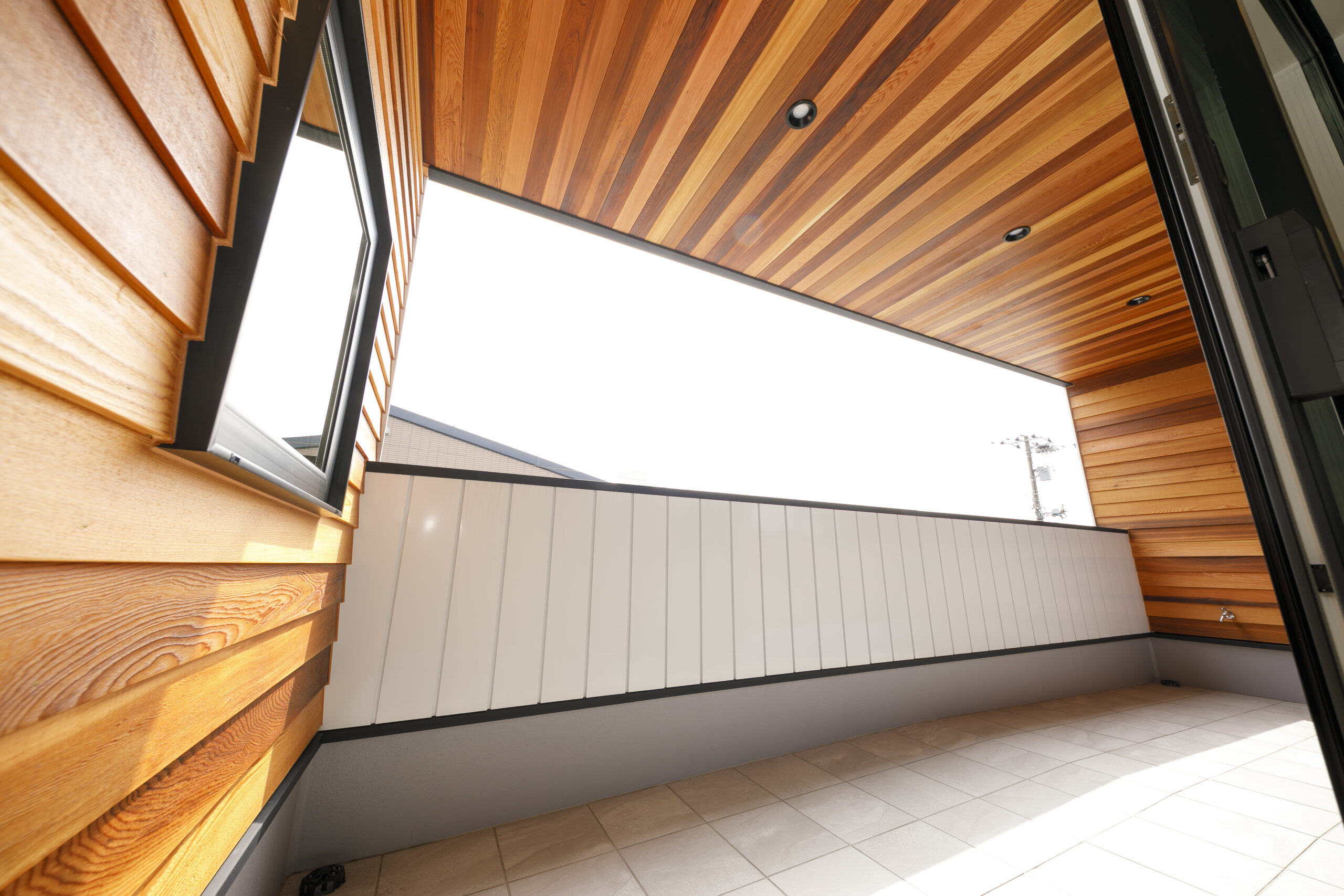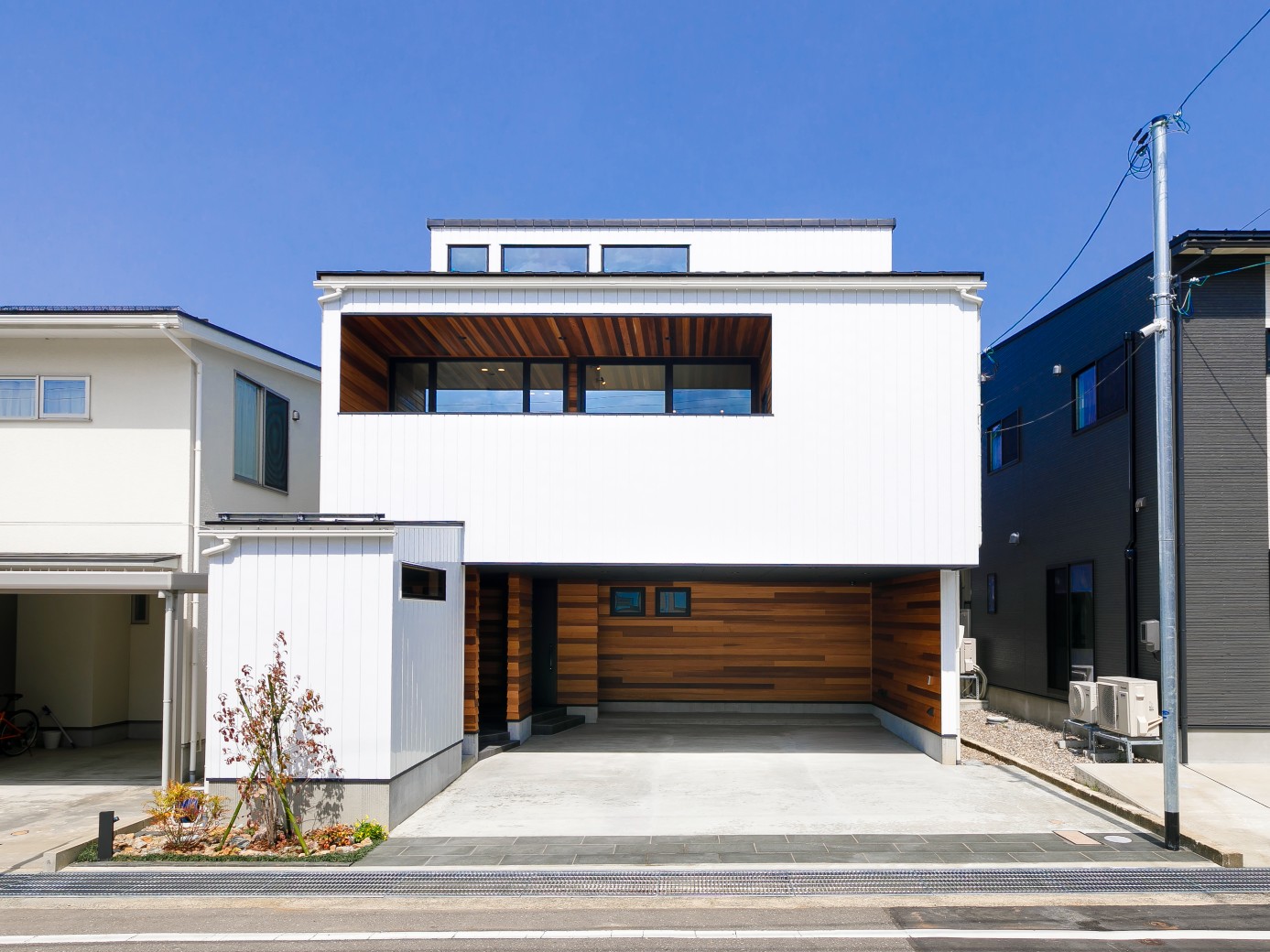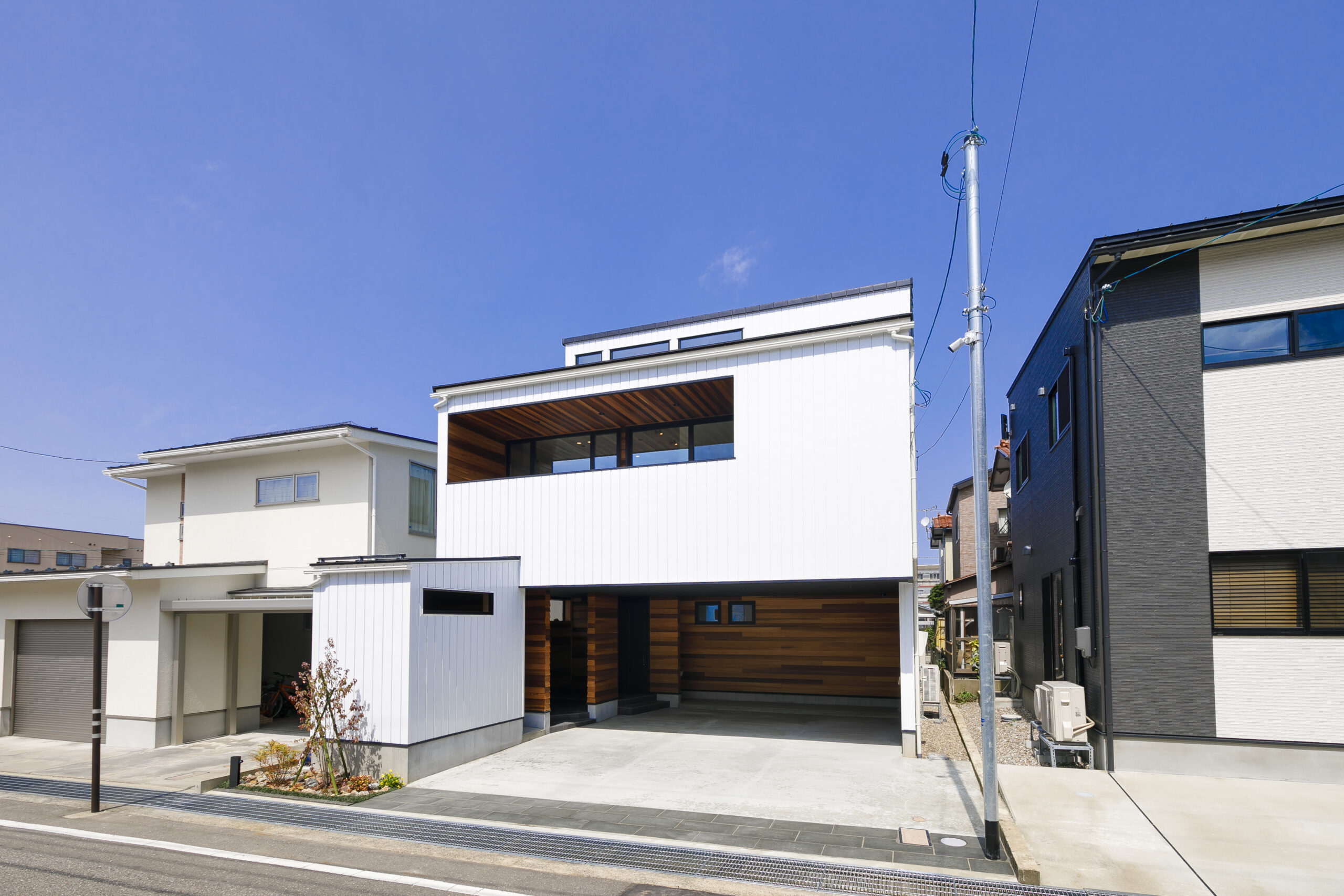 アプローチを兼ねた2台分のインナーガレージを備えた住まい。外壁や軒天にウエスタンレッドシダーを大胆に取り入れた唯一無二のデザインです。2階リビングならではのプライバシーが守られた空間は、ハイサイドライトからたっぷりの光が差し込みます。家族の心がひとつになる上質な住まいとなりました。