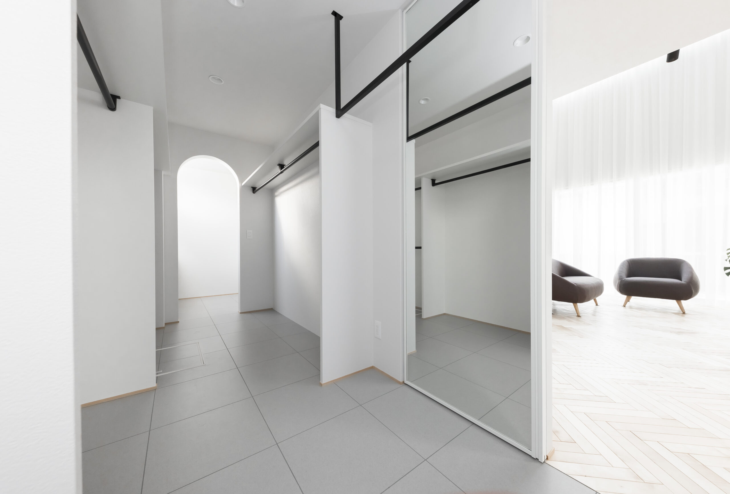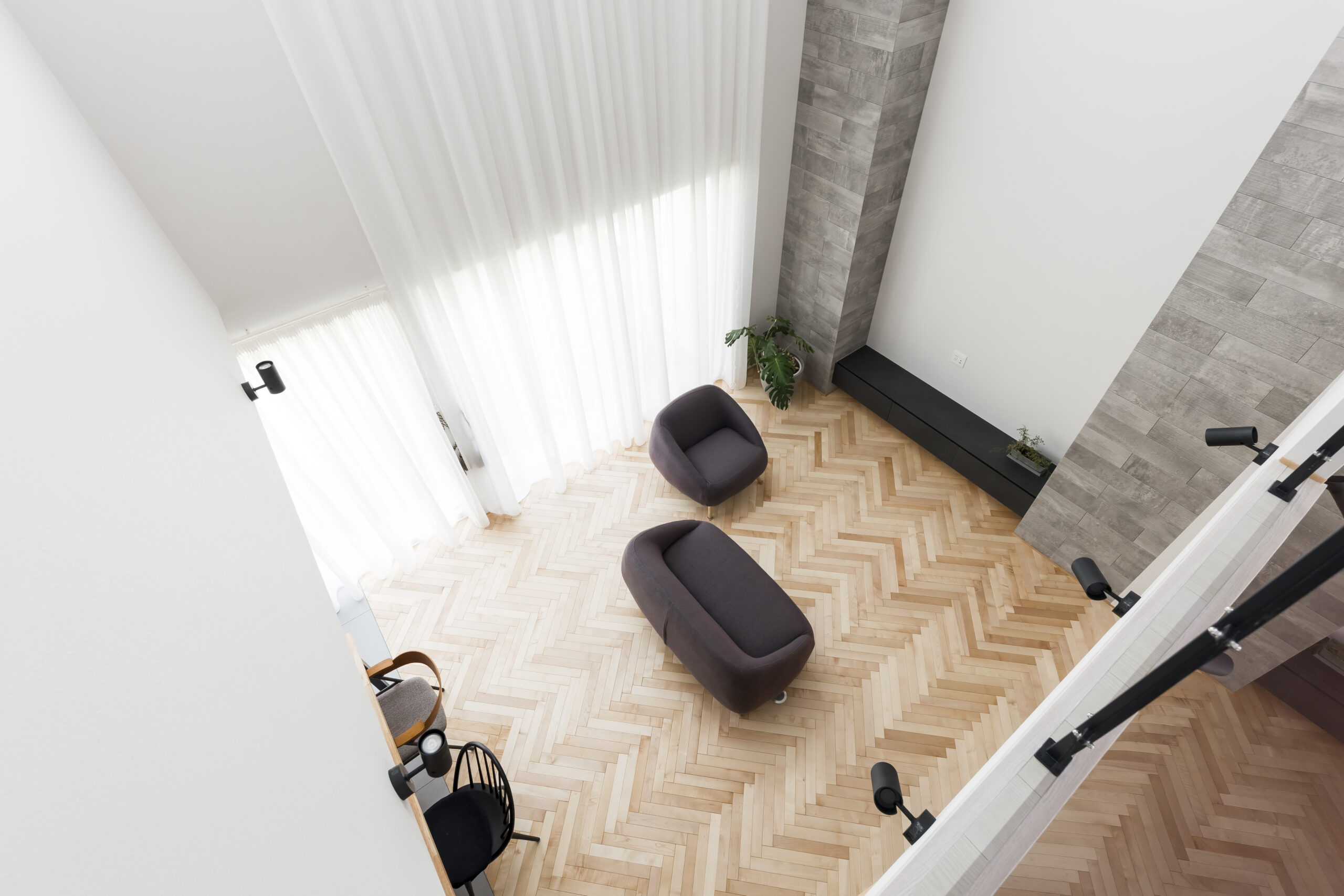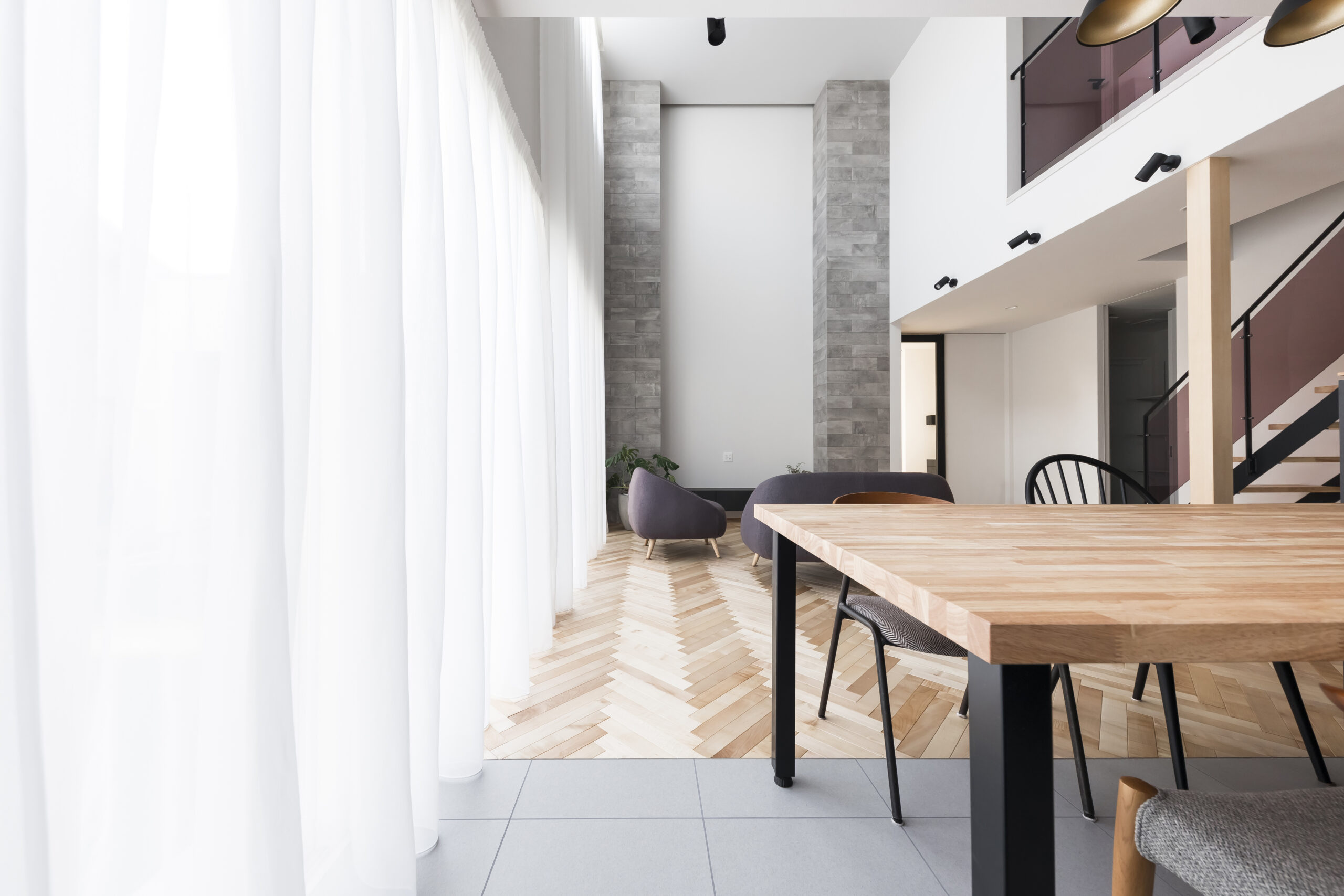シンプルモダンでホテルライクな住まいを思い描き、名付けられた「lune」。洗練された佇まいの中に、非日常の心地よさを感じられる空間構成を大切にしました。屋根付きの駐車スペースからそのまま通り抜け、庭へとつながる動線は、この住まいならではの特徴的なデザイン。外部からの視線を程よく遮りながらも、日常の使い勝手に配慮した、機能美あふれる設えとしています。室内には吹き抜けを設け、シーリングファンがゆったりと回ることで、空間に心地よいリズムをプラス。南側には庭に面した一面の大きな窓と高窓を配置し、天井から床まで続くロング丈のレースカーテン越しに、やわらかな陽光がたっぷりと差し込みます。光と風、視線の抜けを巧みに取り入れた空間は、まるで海外の高級ホテルに滞在しているかのような上質な趣。日常を特別な時間へと昇華させる、洗練された住まいが完成しました。