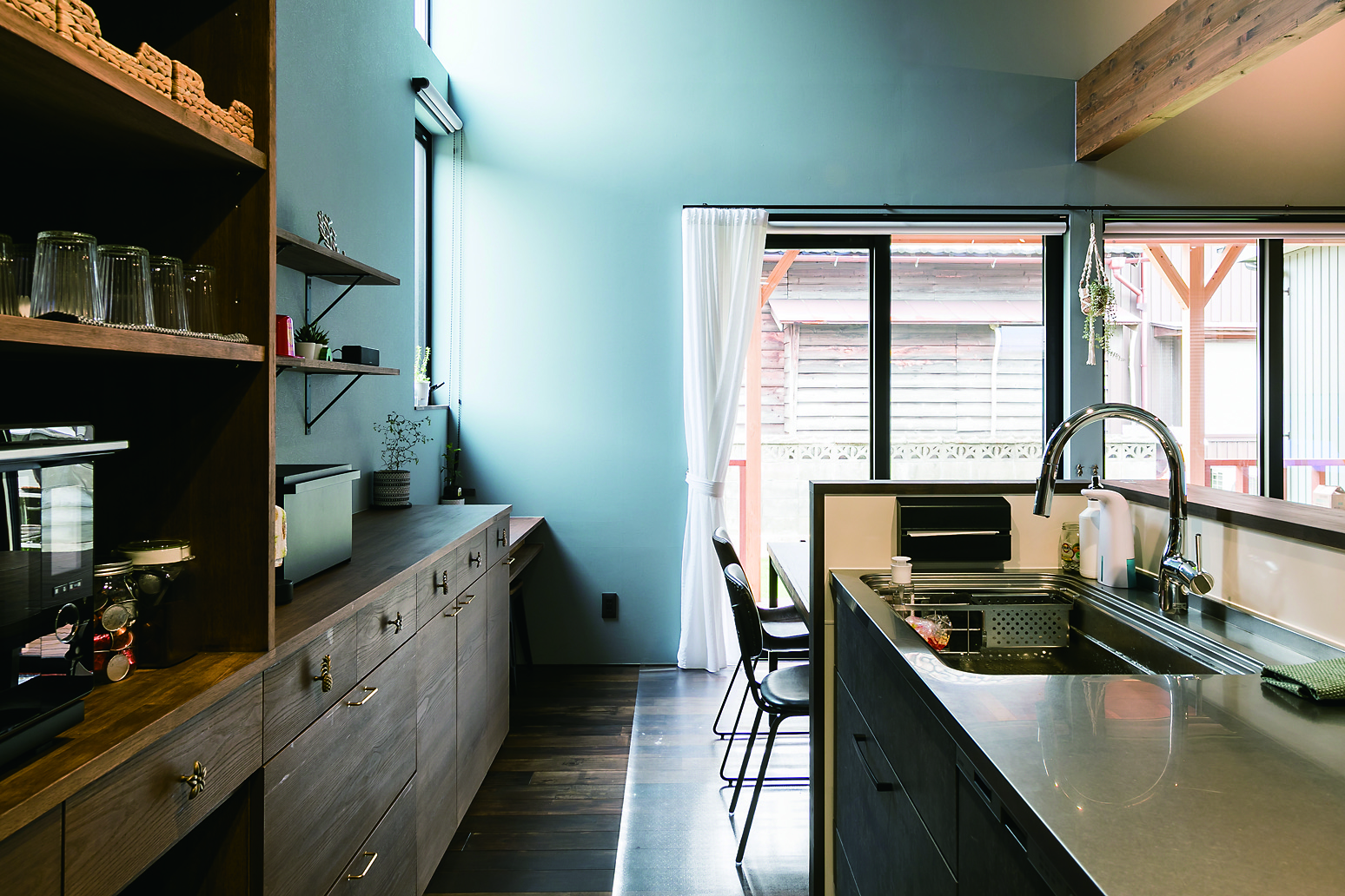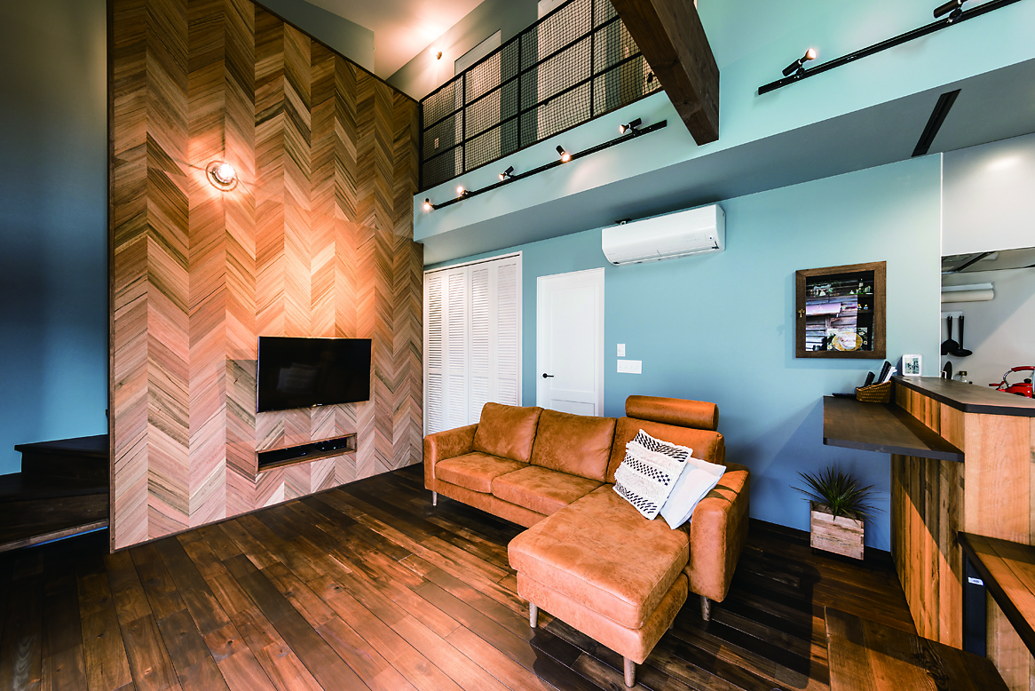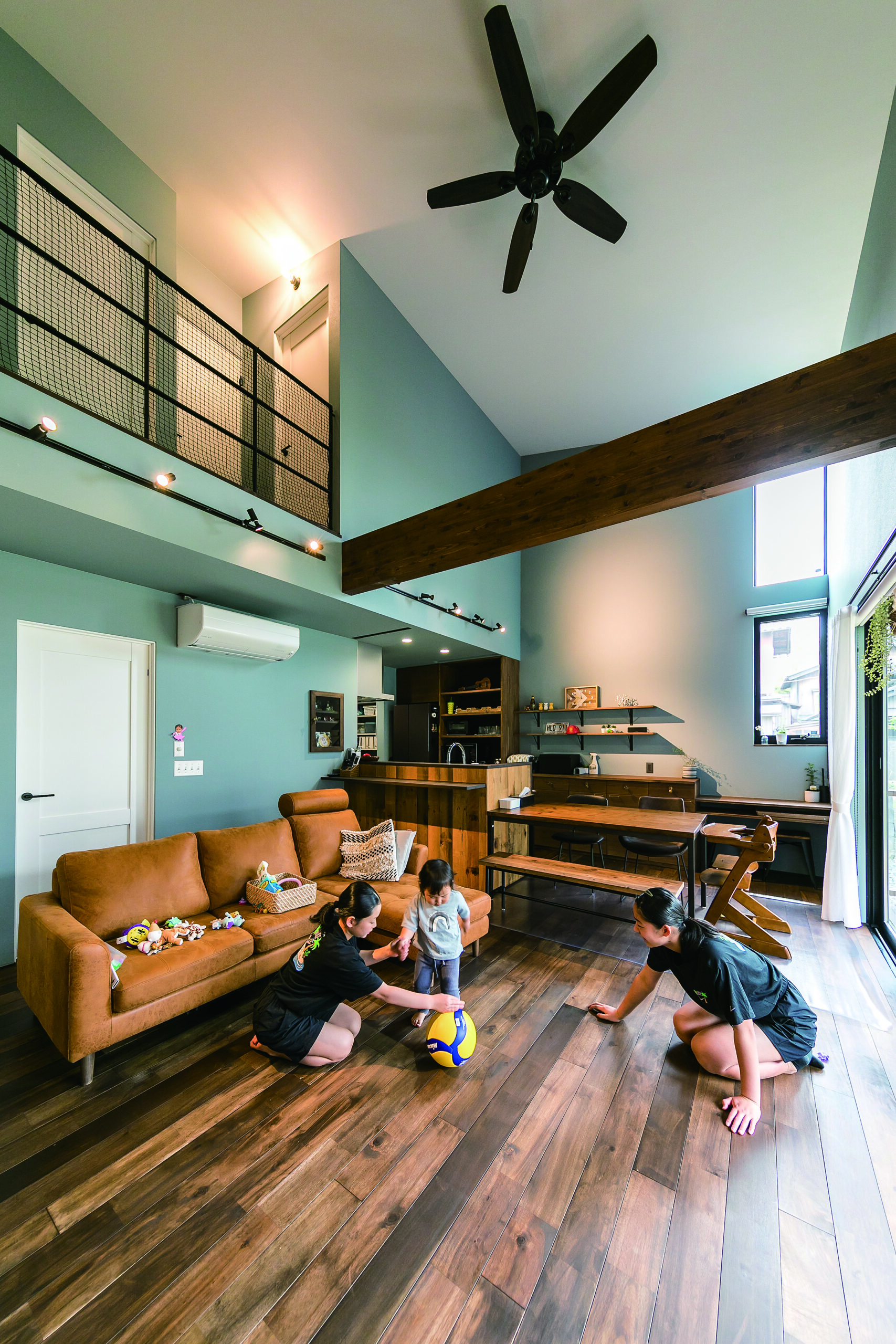 ハワイや西海岸カルチャーの心地よさを取り入れた、開放感あふれる住まい。ブルーグレーと白を基調とした爽やかな空間に、黒のシーリングファンや重厚感のある梁を配し、ラフさの中にも程よい引き締めを感じさせるアクセントとしました。素材や色使いだけでなく、暮らしやすさへの配慮も大切に。鉄骨の手すりは、施工後にネットを取り付けられる仕様とすることで、小さなお子さんのいるご家庭でも安心して選んでいただける設えとしています。住まいの名前「MAHALO」は、オーナー様ご自身に名付けていただいたもの。ハワイ語で「ありがとう」「感謝」を意味するその言葉には、この家で紡がれていく日々への想いが込められています。お客様とともにつくり上げた家づくりの思い出一つひとつが、何よりも桐工房を支える大切な原動力となっています。