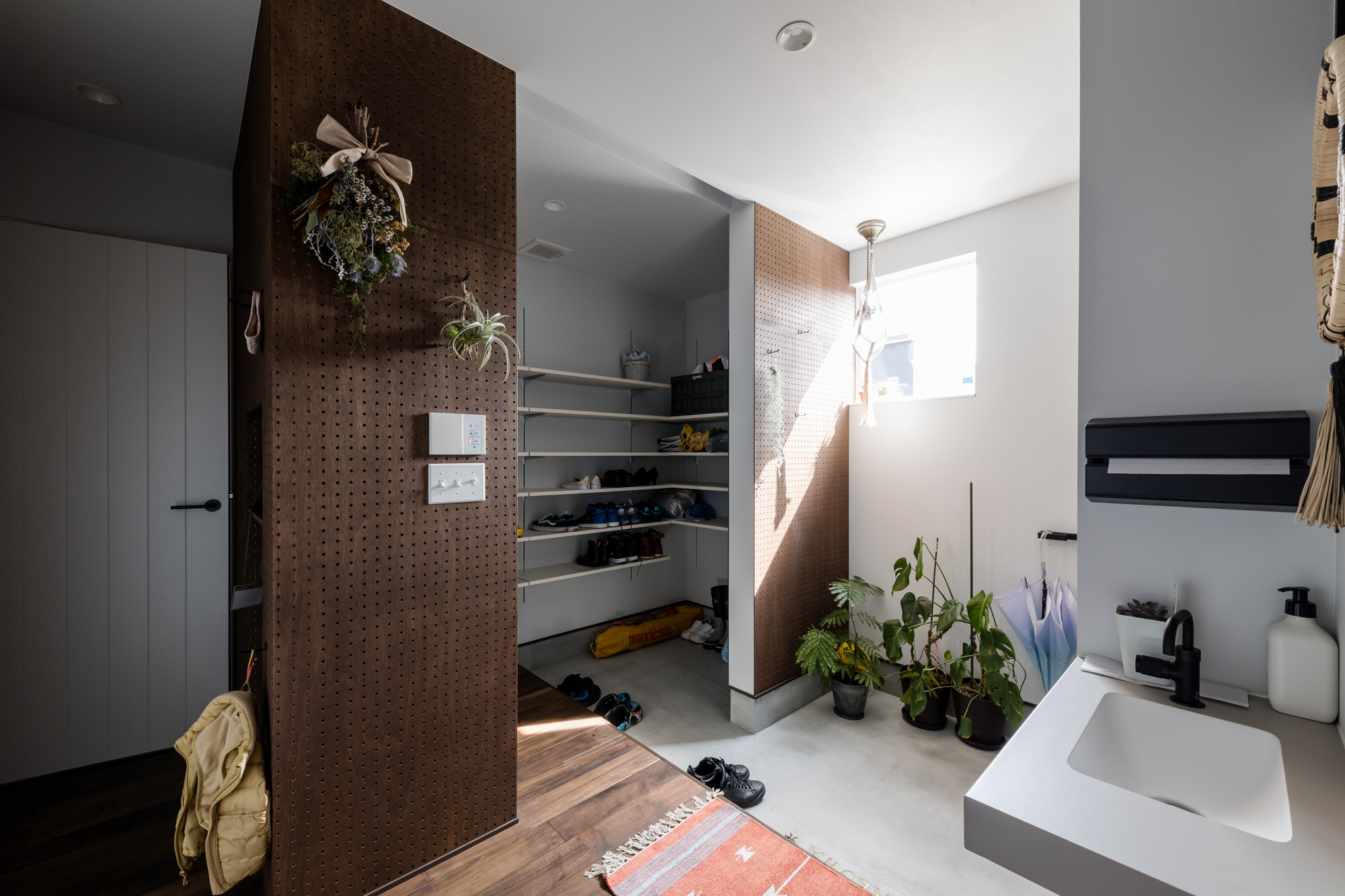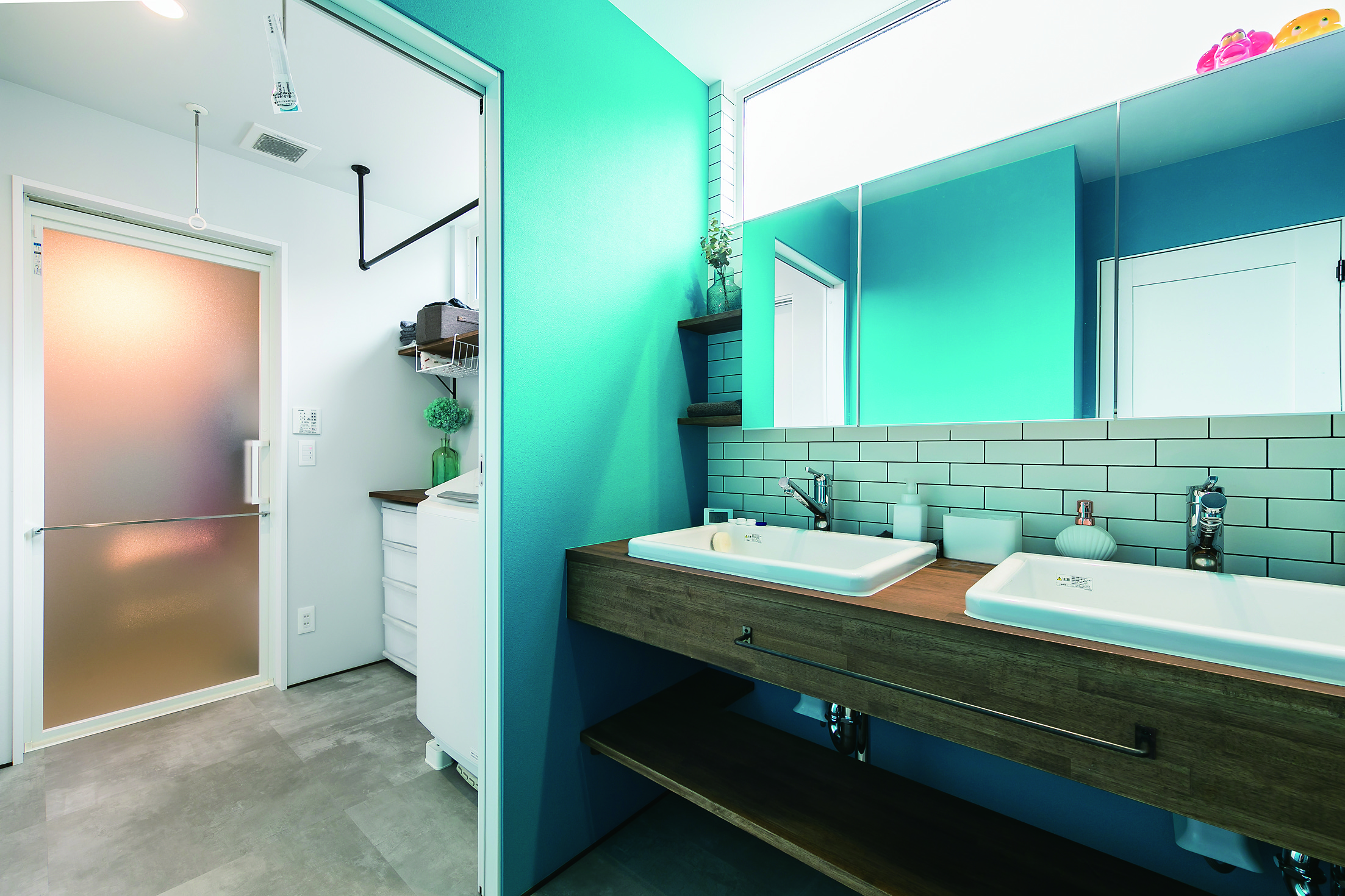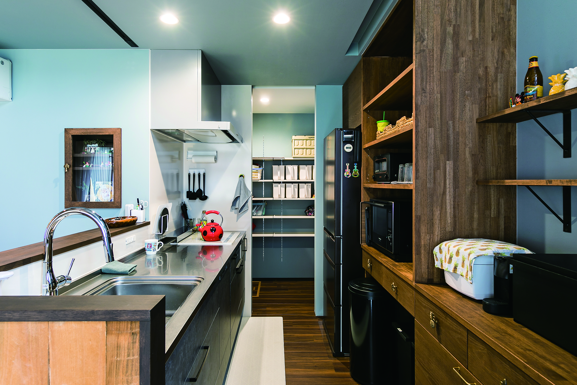 ハワイや西海岸カルチャーの心地よさを取り入れた、開放感あふれる住まい。ブルーグレーと白を基調とした爽やかな空間に、黒のシーリングファンや重厚感のある梁を配し、ラフさの中にも程よい引き締めを感じさせるアクセントとしました。素材や色使いだけでなく、暮らしやすさへの配慮も大切に。鉄骨の手すりは、施工後にネットを取り付けられる仕様とすることで、小さなお子さんのいるご家庭でも安心して選んでいただける設えとしています。住まいの名前「MAHALO」は、オーナー様ご自身に名付けていただいたもの。ハワイ語で「ありがとう」「感謝」を意味するその言葉には、この家で紡がれていく日々への想いが込められています。お客様とともにつくり上げた家づくりの思い出一つひとつが、何よりも桐工房を支える大切な原動力となっています。