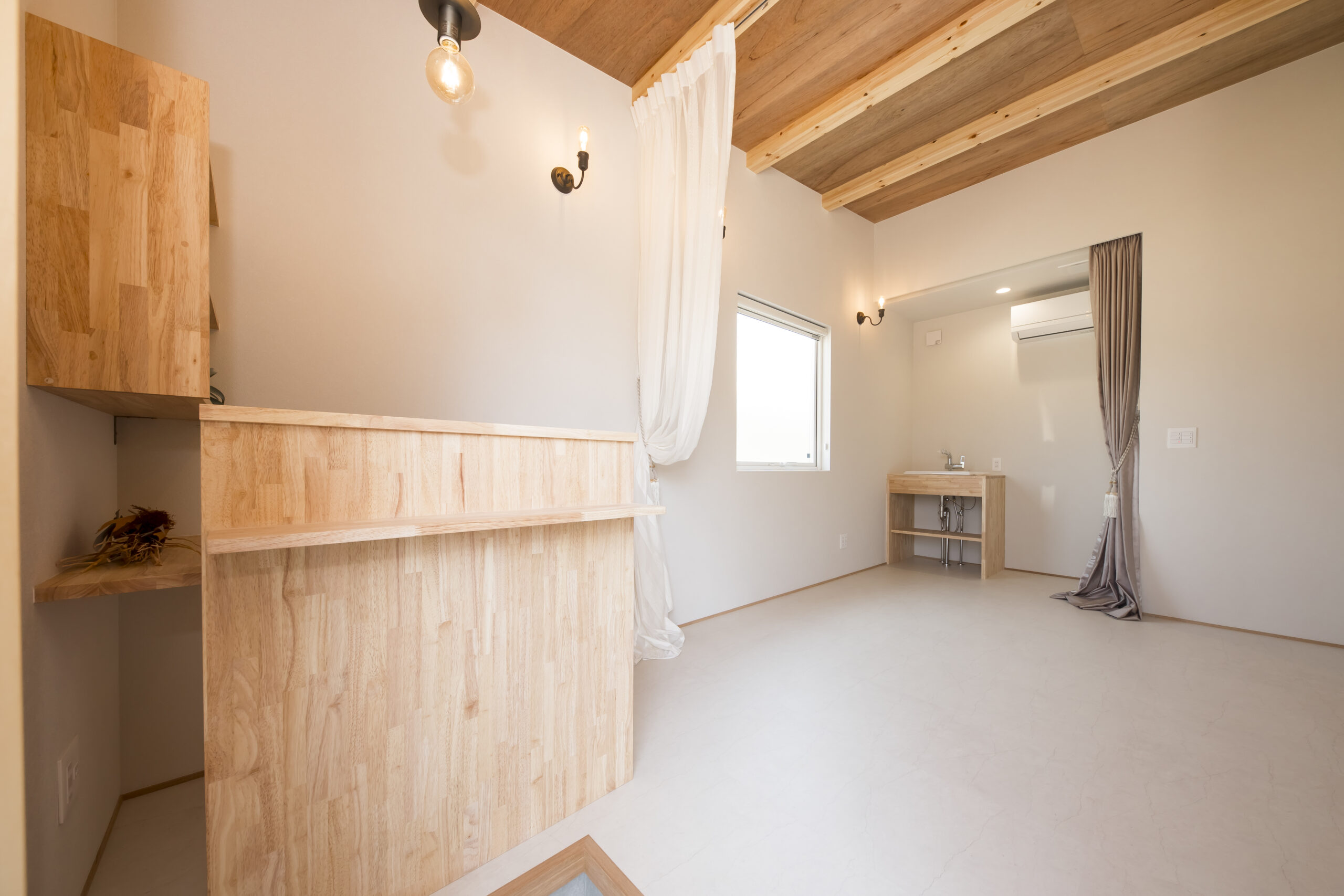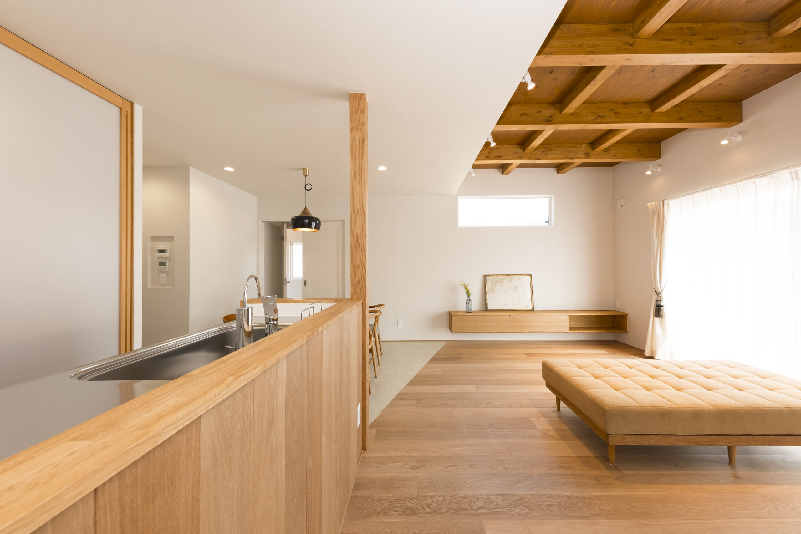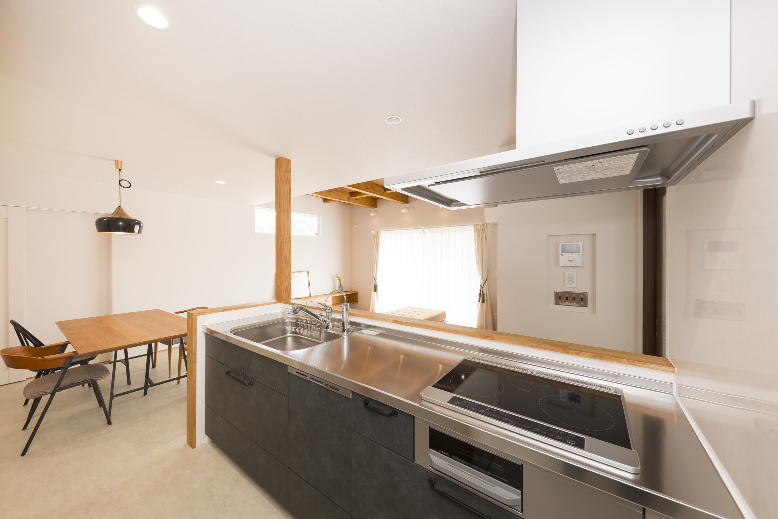 1階に奥様のサロンを併設した住まい。LDKや水回りも1階に集約し、暮らしの重心を1階に置いた設計が特徴です。仕事と家事を両立しやすいよう、日々の負担を軽減する間取りとしました。LDKは構造現しとすることで、木の温もりを感じられる心地よい空間に。キッチン背面の収納はハイドアで隠す仕様とし、生活感を抑えたすっきりとした印象を保ちます。サロン空間は、家具や小物が美しく映えるよう明るい床材を採用。天井の構造材がより引き立ち、上質で落ち着きのある雰囲気を演出しています。住まいの名前は「sense」。オーナーのセンスと、桐工房が得意とする木を活かした家づくりが共鳴して生まれた住まいです。