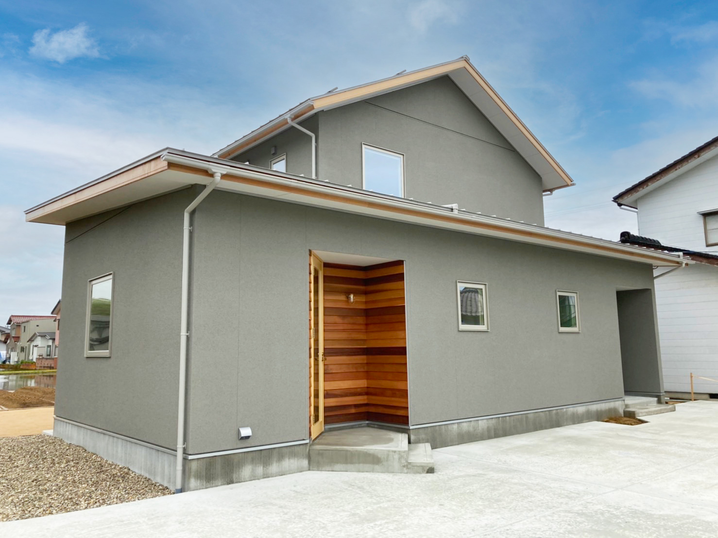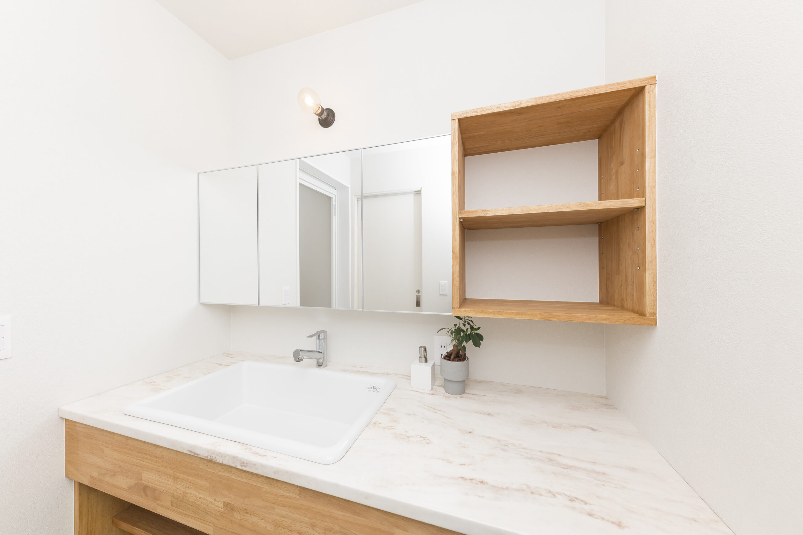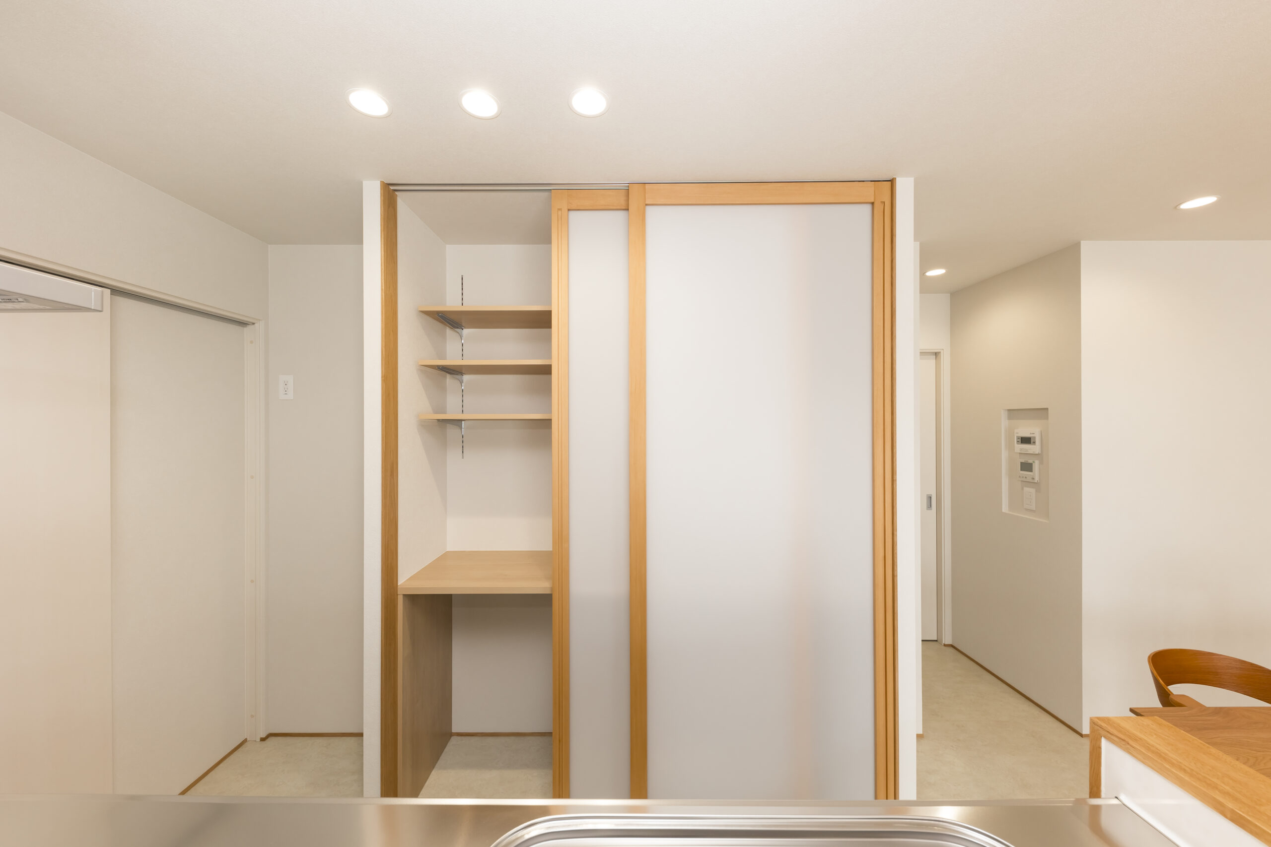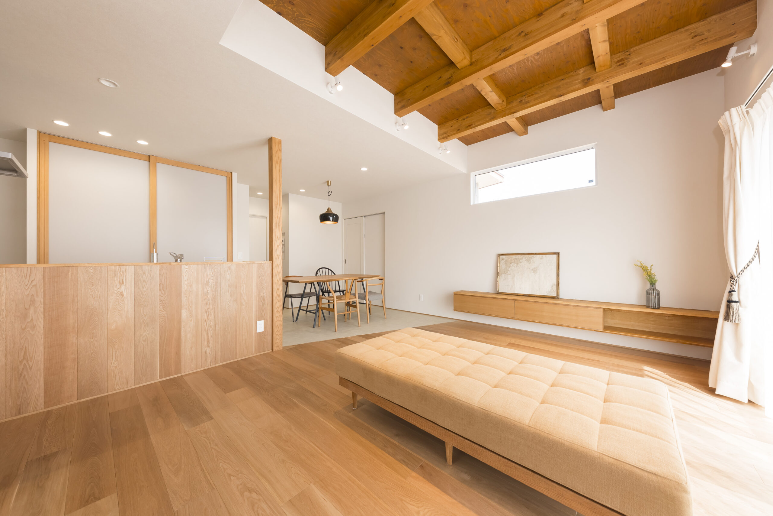1階に奥様のサロンを併設した住まい。LDKや水回りも1階に集約し、暮らしの重心を1階に置いた設計が特徴です。仕事と家事を両立しやすいよう、日々の負担を軽減する間取りとしました。LDKは構造現しとすることで、木の温もりを感じられる心地よい空間に。キッチン背面の収納はハイドアで隠す仕様とし、生活感を抑えたすっきりとした印象を保ちます。サロン空間は、家具や小物が美しく映えるよう明るい床材を採用。天井の構造材がより引き立ち、上質で落ち着きのある雰囲気を演出しています。住まいの名前は「sense」。オーナーのセンスと、桐工房が得意とする木を活かした家づくりが共鳴して生まれた住まいです。