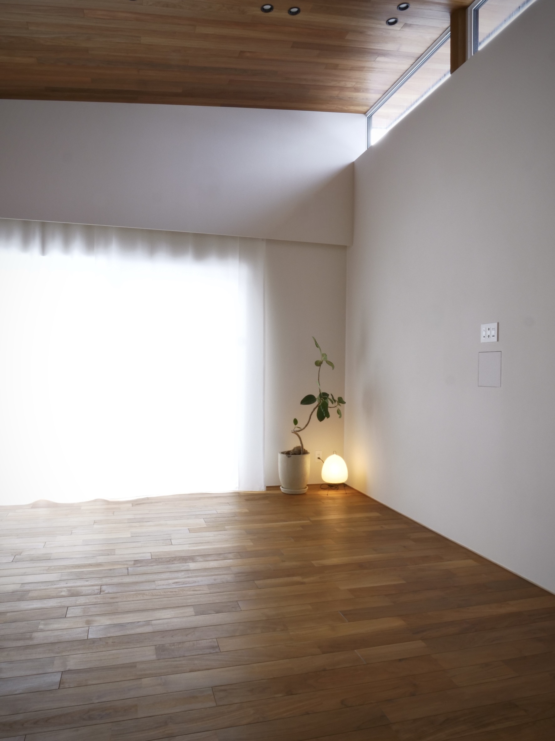 外観はブラックを基調に軒裏に採用したリンゴアの羽目板が美しく調和し、二つの箱が重なり合うような、量感と奥行きを感じさせる堂々とした佇まい。1階の天井高はH2.5mを確保し、LDKには最大H3.9mの勾配天井とすることで、縦方向への広がりも強調した、開放感あふれる空間となりました。外部に採用したリンゴアの羽目板は、LDKの勾配天井にも連続して施工し、ハイサイドライトから軒裏へと視線がつながる、内外一体感のある空間構成に。住まいのために特別に製作した無垢材の巾木は、足元をすっきりと見せると同時に、空間全体をより洗練された印象へと格上げしてくれます。床材にはチークの無垢フローリングを、LDKなどの壁面には珪藻土を採用しました。デザイン性はもちろんのこと、質感や素材、納まり一つひとつにまでこだわり抜いた上質な住まいです。