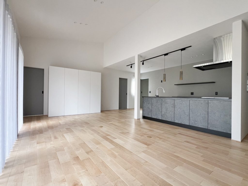 LDKには屋根の傾斜に合わせた勾配天井を取り入れ、実際の広さ以上の開放感を演出しました。